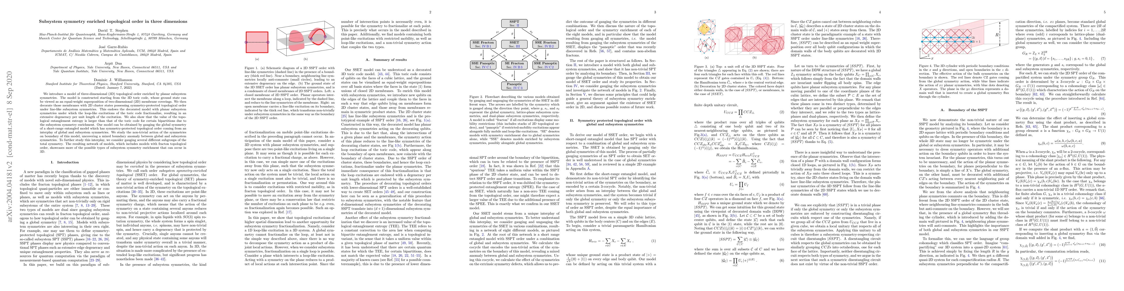 This paper proposes a 3D topological order model enriched by planar subsystem symmetries, starting from the toric code and decorating its membranes with symmetry-protected topological 2D cluster states. The resulting model exhibits extensive degeneracy per unit length of excitations and a larger topological entanglement entropy, demonstrating complex interplay between global and subsystem symmetries.