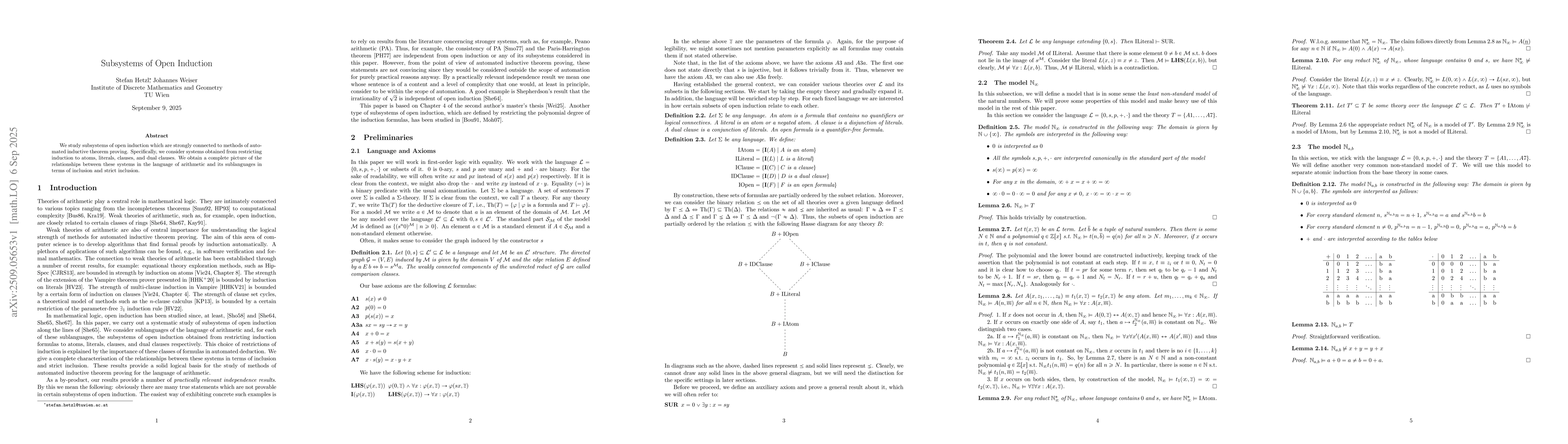 We study subsystems of open induction which are strongly connected to methods of automated inductive theorem proving. Specifically, we consider systems obtained from restricting induction to atoms, literals, clauses, and dual clauses. We obtain a complete picture of the relationships between these systems in the language of arithmetic and its sublanguages in terms of inclusion and strict inclusion.
