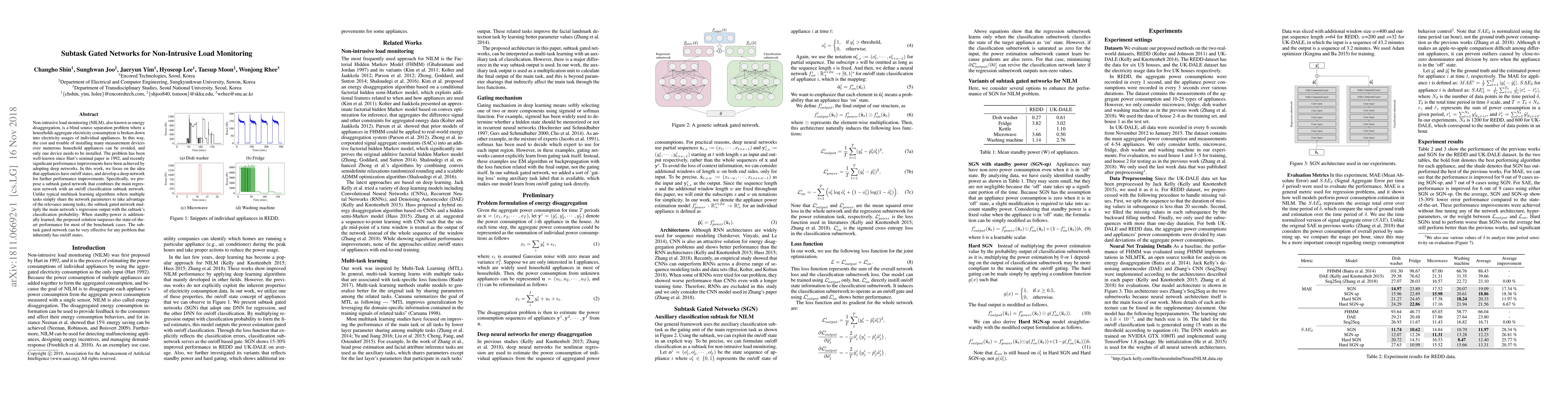 Non-intrusive load monitoring (NILM), also known as energy disaggregation, is a blind source separation problem where a household's aggregate electricity consumption is broken down into electricity usages of individual appliances. In this way, the cost and trouble of installing many measurement devices over numerous household appliances can be avoided, and only one device needs to be installed. The problem has been well-known since Hart's seminal paper in 1992, and recently significant performance improvements have been achieved by adopting deep networks. In this work, we focus on the idea that appliances have on/off states, and develop a deep network for further performance improvements. Specifically, we propose a subtask gated network that combines the main regression network with an on/off classification subtask network. Unlike typical multitask learning algorithms where multiple tasks simply share the network parameters to take advantage of the relevance among tasks, the subtask gated network multiply the main network's regression output with the subtask's classification probability. When standby-power is additionally learned, the proposed solution surpasses the state-of-the-art performance for most of the benchmark cases. The subtask gated network can be very effective for any problem that inherently has on/off states.