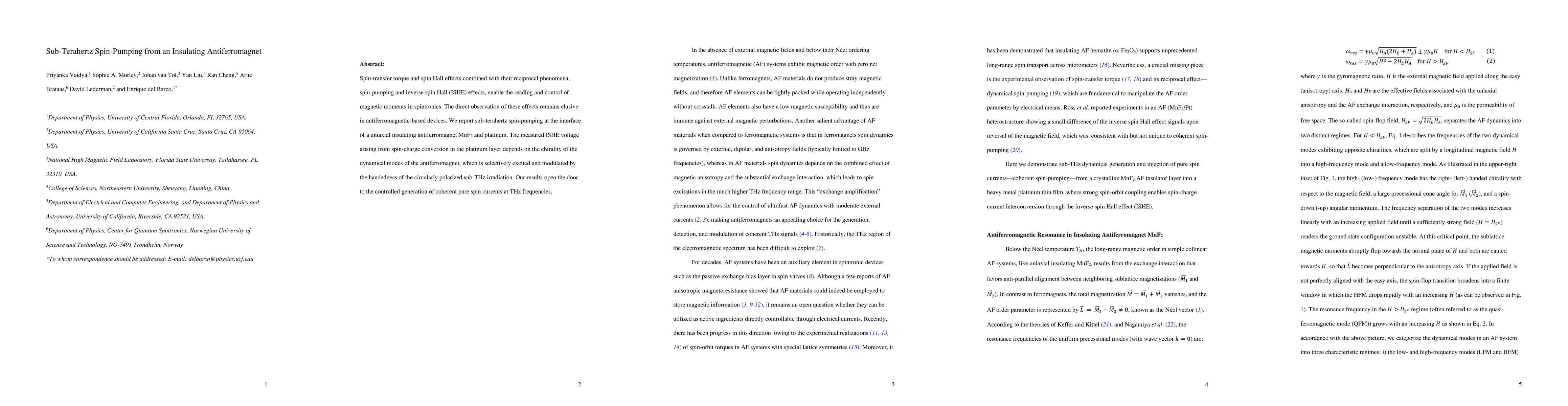 This paper reports the observation of sub-terahertz spin-pumping at the interface of an insulating antiferromagnet MnF2 and platinum, revealing the dependence of the inverse spin Hall effect on the chirality of the antiferromagnetic modes. These findings enable the controlled generation of coherent pure spin currents at THz frequencies.