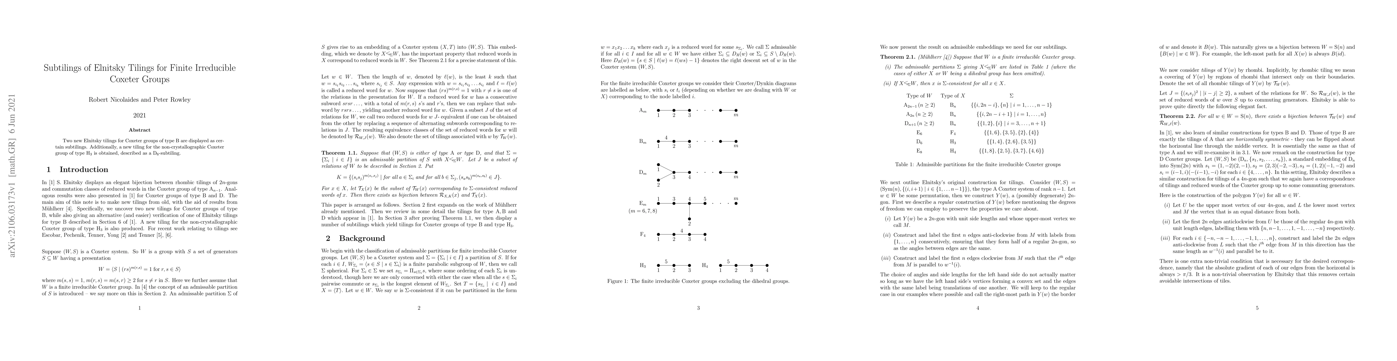 Two new Elnitsky tilings for Coxeter groups of type $\mathrm{B}$ are displayed as certain subtilings. Additionally, a new tiling for the non-crystallographic Coxeter group of type $\mathrm{H}_3$ is obtained, described as a $\mathrm{D}_6$-subtiling.