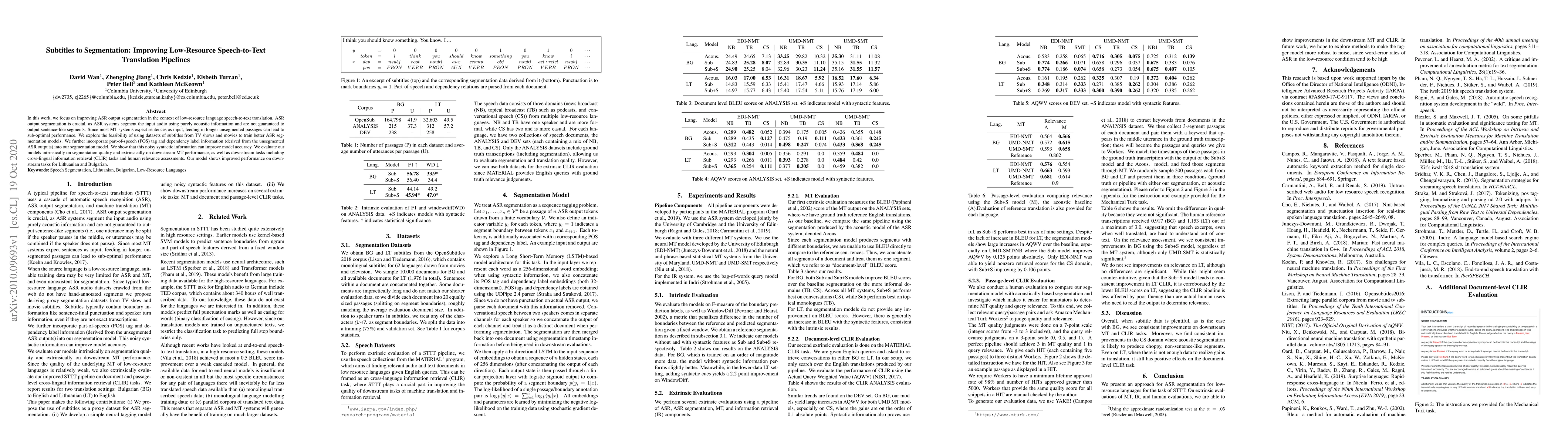 This paper investigates using subtitle datasets to improve ASR output segmentation in low-resource language speech-to-text translation, incorporating POS tags and dependency labels to enhance segmentation accuracy. The proposed method shows improved downstream MT performance and relevance in cross-lingual tasks for Lithuanian and Bulgarian.