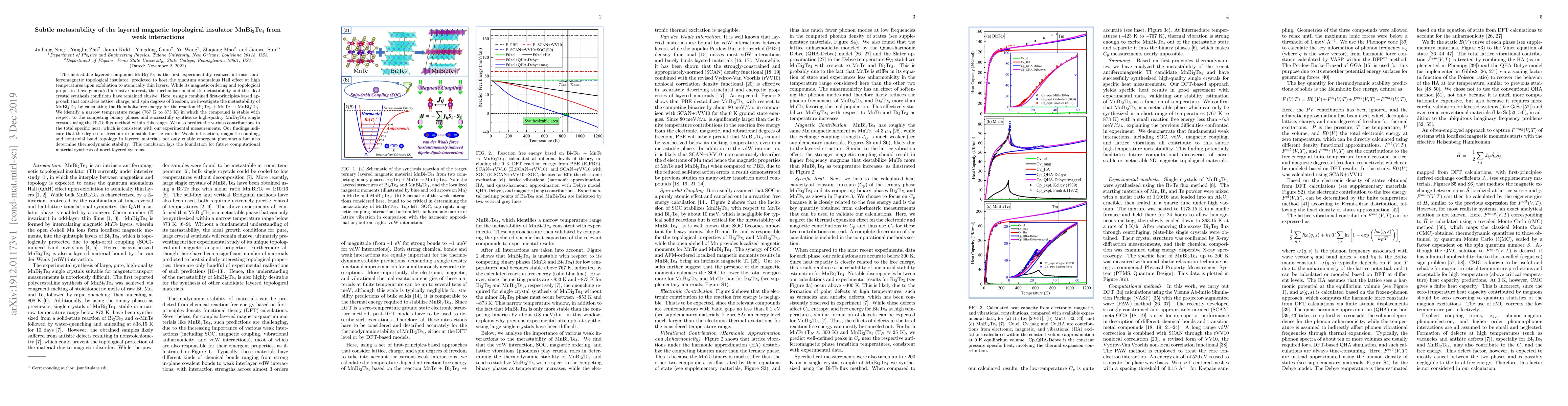 This research identifies a narrow temperature range for the stable synthesis of the metastable compound MnBi2Te4, the first intrinsic antiferromagnetic topological insulator, and predicts its thermodynamic stability through a combined first-principles approach. The study also synthesizes high-quality MnBi2Te4 crystals using the Bi-Te flux method, laying the groundwork for future material synthesis in layered systems.