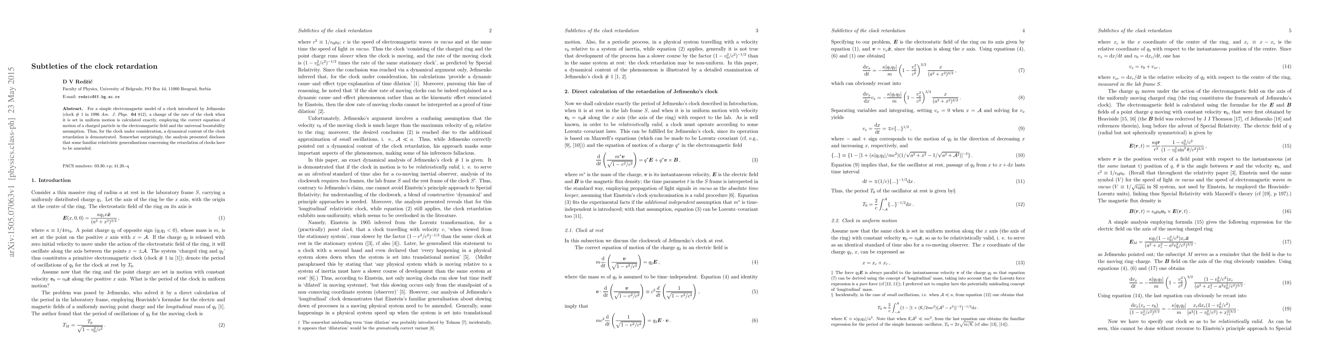 For a simple electromagnetic model of a clock introduced by Jefimenko (clock $\#$ 1 in 1996 {\it Am. J. Phys.} {\bf 64} 812), a change of the rate of the clock when it is set in uniform motion is calculated exactly, employing the correct equation of motion of a charged particle in the electromagnetic field and the universal boostability assumption. Thus, for the clock under consideration, a dynamical content of the clock retardation is demonstrated. Somewhat surprisingly, the analysis presented discloses that some familiar relativistic generalisations concerning the retardation of clocks have to be amended.