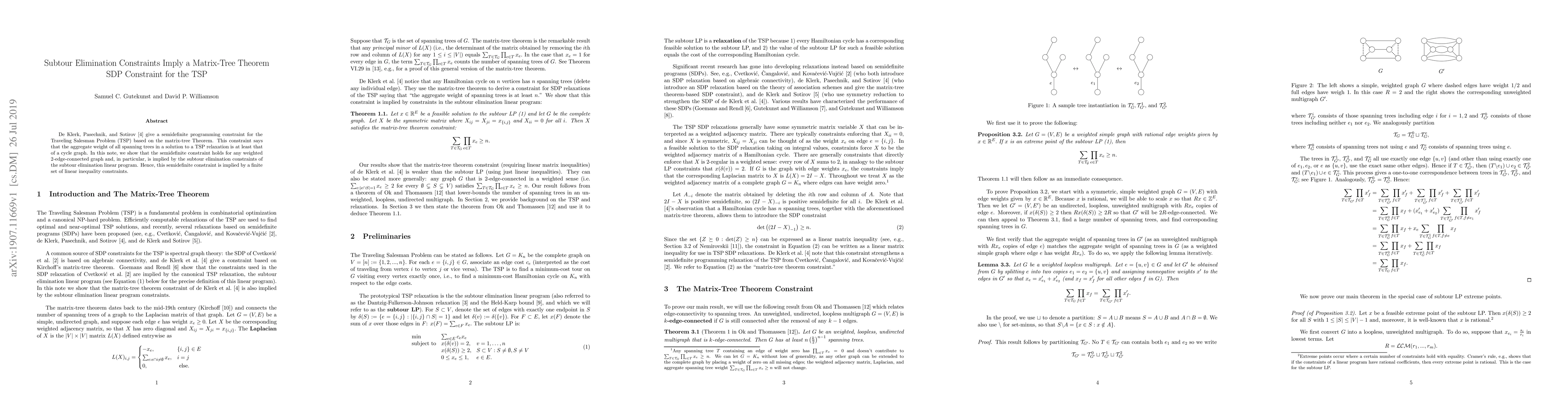 De Klerk, Pasechnik, and Sotirov give a semidefinite programming constraint for the Traveling Salesman Problem (TSP) based on the matrix-tree Theorem. This constraint says that the aggregate weight of all spanning trees in a solution to a TSP relaxation is at least that of a cycle graph. In this note, we show that the semidefinite constraint holds for any weighted 2-edge-connected graph and, in particular, is implied by the subtour elimination constraints of the subtour elimination linear program. Hence, this semidefinite constraint is implied by a finite set of linear inequality constraints.