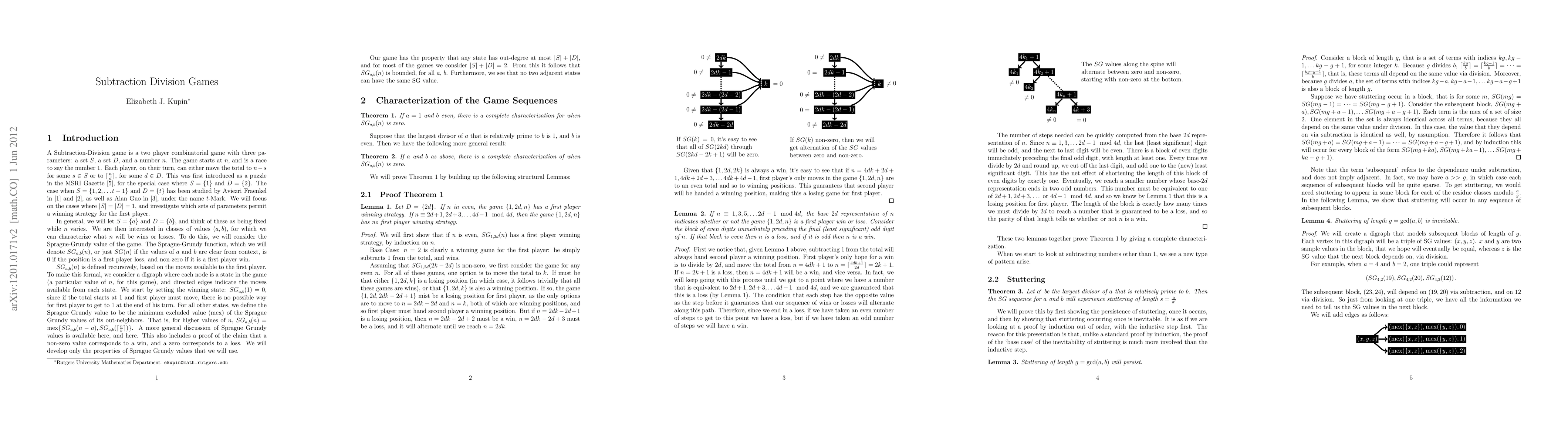 A Subtraction-Division game is a two player combinatorial game with three parameters: a set S, a set D, and a number n. The game starts at n, and is a race to say the number 1. Each player, on their turn, can either move the total to n-s for some s in S or to \lceil\frac{n}{d}\rceil, for some d in D (i.e. either subtract s or divide by d and round up). This paper examines in detail the Sprague-Grundy sequences for the games when |S|=|D|=1. For a large class of these games, the patterns in the sequences allow for a characterization of all the winning positions. The paper also proves that, for the same large class, these sequences are automatic. In the process, a large family of recurrences that completely determine their behavior is constructed.