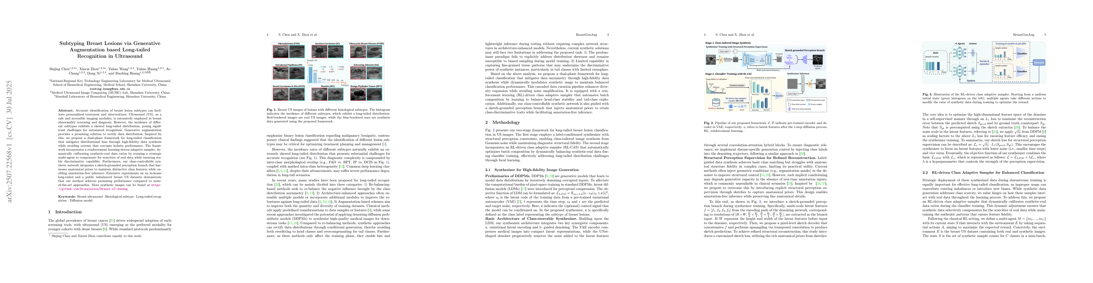 The research proposes a dual-phase framework for long-tailed classification of breast lesion subtypes in ultrasound images, utilizing generative augmentation to address data distribution skewness. This framework includes a reinforcement learning-driven adaptive sampler and a class-controllable synthetic network with a sketch-grounded perception branch.
