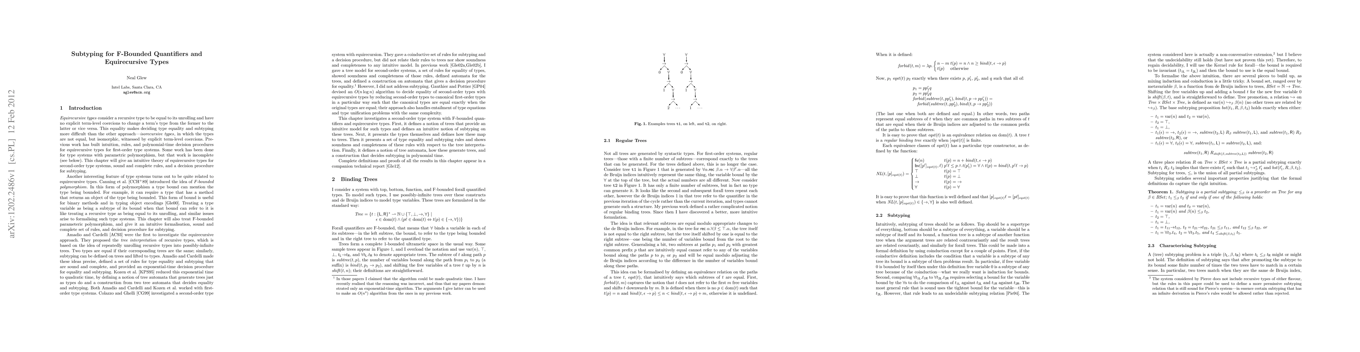 This paper defines a notion of binding trees that provide a suitable model for second-order type systems with F-bounded quantifiers and equirecursive types. It defines a notion of regular binding trees that correspond in the right way to notions of regularity in the first-order case. It defines a notion of subtyping on these trees and proves various properties of the subtyping relation. It defines a mapping from types to trees and shows that types produce regular binding trees. It presents a set of type equality and subtyping rules, and proves them sound and complete with respect to the tree interpretation. It defines a notion of binding-tree automata and how these generate regular binding trees. It gives a polynomial-time algorithm for deciding when two automata's trees are in the subtyping relation.