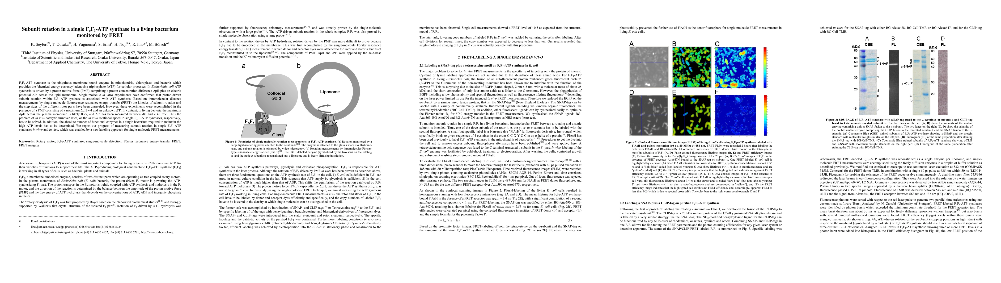 FoF1-ATP synthase is the ubiquitous membrane-bound enzyme in mitochondria, chloroplasts and bacteria which provides the 'chemical energy currency' adenosine triphosphate (ATP) for cellular processes. In Escherichia coli ATP synthesis is driven by a proton motive force (PMF) comprising a proton concentration difference {\Delta}pH plus an electric potential {\Delta}{\Psi} across the lipid membrane. Single-molecule in vitro experiments have confirmed that proton-driven subunit rotation within FoF1-ATP synthase is associated with ATP synthesis. Based on intramolecular distance measurements by single-molecule fluorescence resonance energy transfer (FRET) the kinetics of subunit rotation and the step sizes of the different rotor parts have been unraveled. However, these experiments were accomplished in the presence of a PMF consisting of a maximum {\Delta}pH ~ 4 and an unknown {\Delta}{\Psi}. In contrast, in living bacteria the maximum {\Delta}pH across the plasma membrane is likely 0.75, and {\Delta}{\Psi} has been measured between -80 and -140 mV. Thus the problem of in vivo catalytic turnover rates, or the in vivo rotational speed in single FoF1-ATP synthases, respectively, has to be solved. In addition, the absolute number of functional enzymes in a single bacterium required to maintain the high ATP levels has to be determined. We report our progress of measuring subunit rotation in single FoF1-ATP synthases in vitro and in vivo, which was enabled by a new labeling approach for single-molecule FRET measurements.