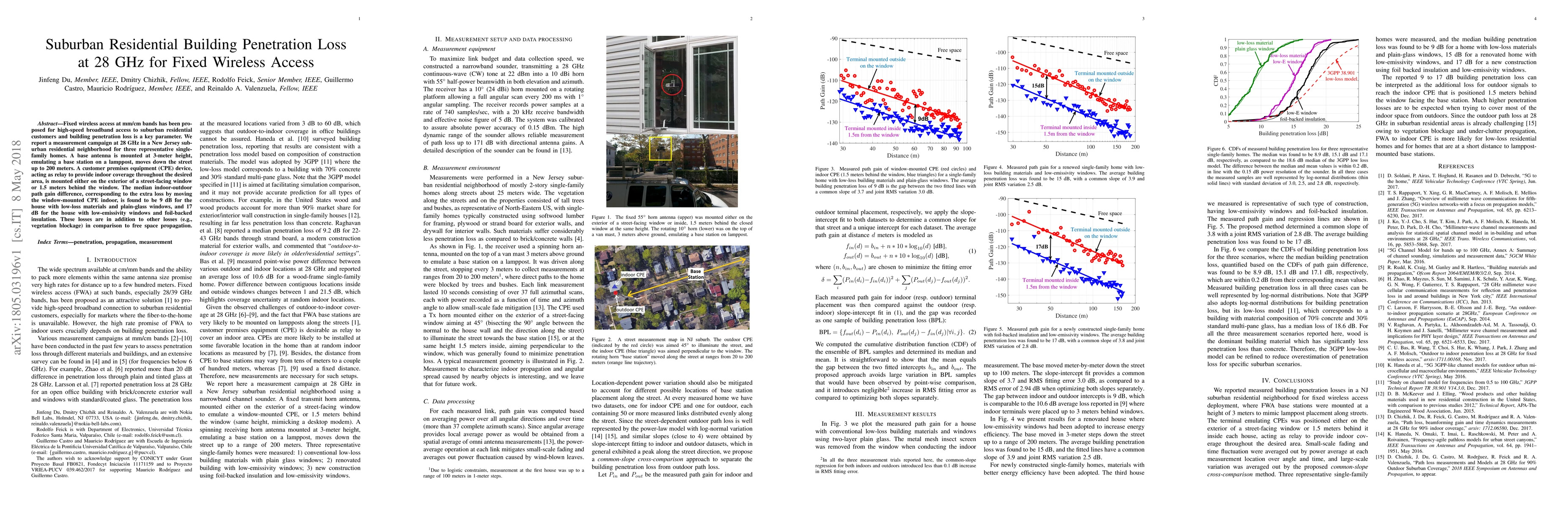 This study measures building penetration loss at 28 GHz in suburban homes, finding median indoor-outdoor path gain differences of 9 dB for homes with standard materials and 17 dB for those with low-emissivity windows and insulation. These results highlight the impact of building materials on fixed wireless access performance.