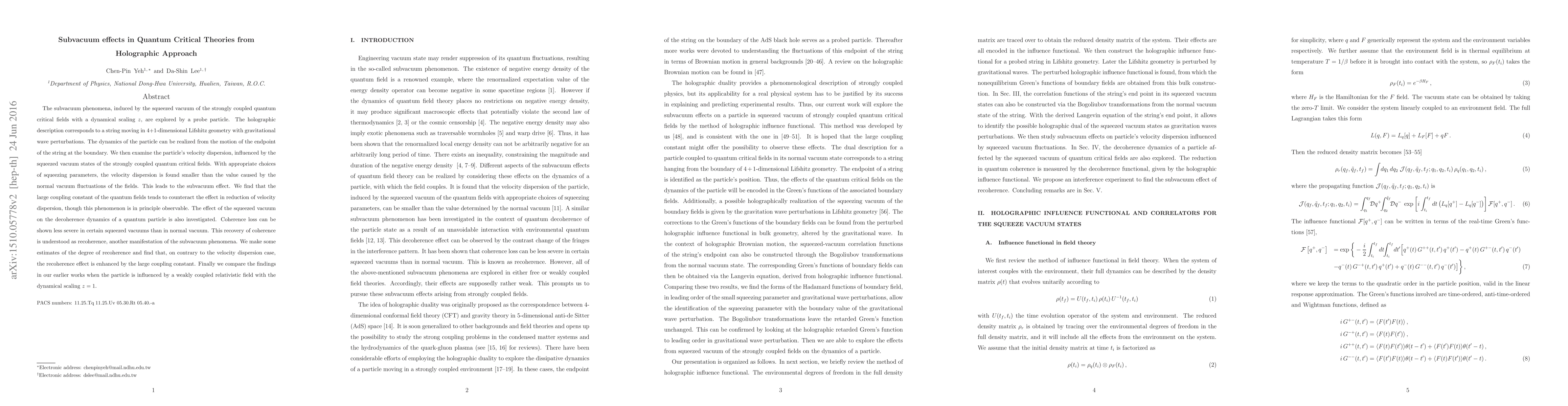 This paper investigates subvacuum effects in quantum critical theories using a holographic approach, focusing on the influence of a squeezed vacuum state on particle dynamics. It finds that the squeezed vacuum can reduce velocity dispersion and decoherence, leading to observable subvacuum phenomena, with the degree of recoherence proportional to the large coupling constant of quantum critical fields.