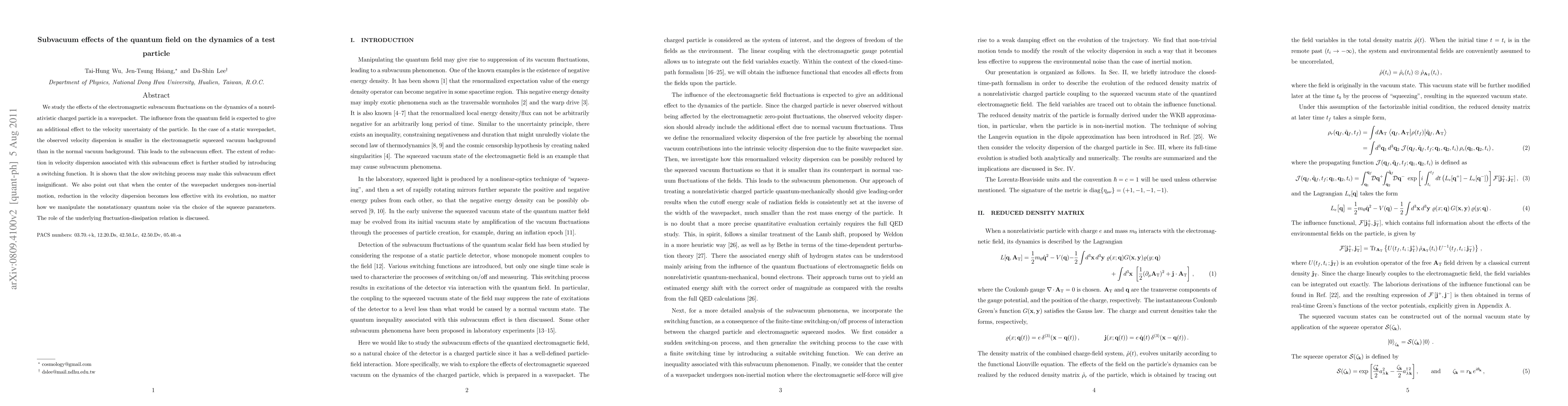We study the effects of the electromagnetic subvacuum fluctuations on the dynamics of a nonrelativistic charged particle in a wavepacket. The influence from the quantum field is expected to give an additional effect to the velocity uncertainty of the particle. In the case of a static wavepacket, the observed velocity dispersion is smaller in the electromagnetic squeezed vacuum background than in the normal vacuum background. This leads to the subvacuum effect. The extent of reduction in velocity dispersion associated with this subvacuum effect is further studied by introducing a switching function. It is shown that the slow switching process may make this subvacuum effect insignificant. We also point out that when the center of the wavepacket undergoes non-inertial motion, reduction in the velocity dispersion becomes less effective with its evolution, no matter how we manipulate the nonstationary quantum noise via the choice of the squeeze parameters. The role of the underlying fluctuation-dissipation relation is discussed.