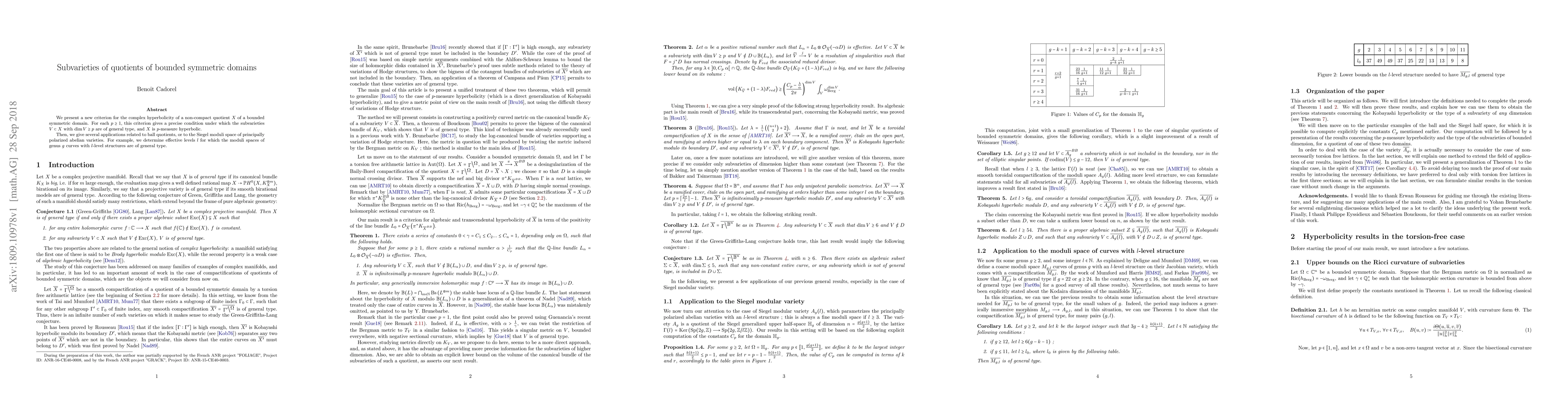 This paper provides a new criterion for determining the complex hyperbolicity of non-compact quotients of bounded symmetric domains, establishing conditions under which certain subvarieties are of general type and the domain is p-measure hyperbolic. It applies these criteria to specific cases like ball quotients and Siegel moduli spaces, determining effective levels for moduli spaces of genus g curves with level structures.