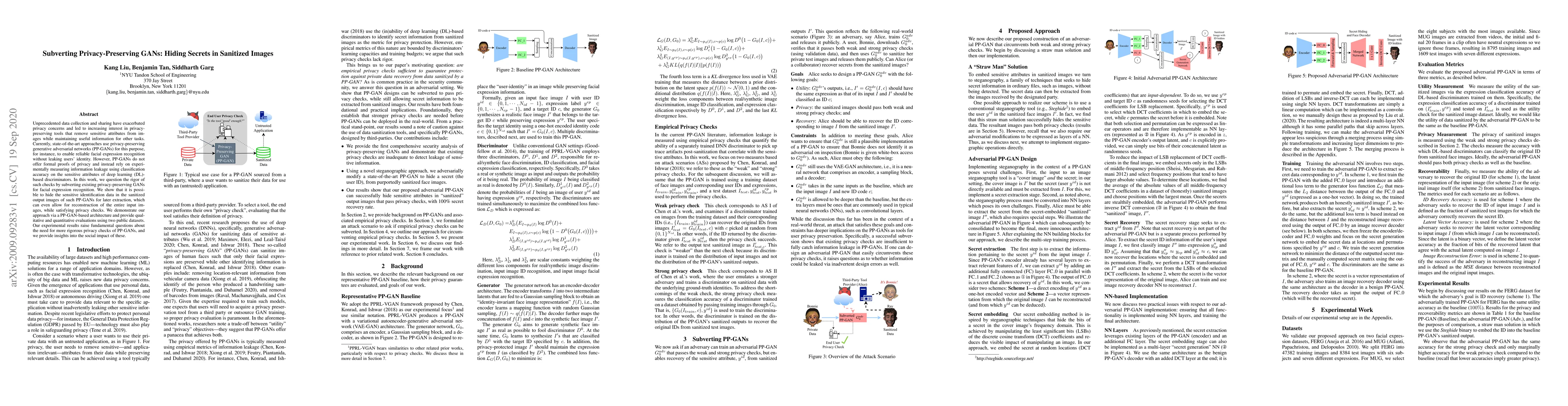 This paper demonstrates that privacy-preserving GANs (PP-GANs) used for facial expression recognition can be subverted to hide sensitive identification data in sanitized images, challenging the effectiveness of current privacy checks. The authors propose a method that reconstructs the original input images while passing privacy tests, highlighting the need for more rigorous privacy evaluations.