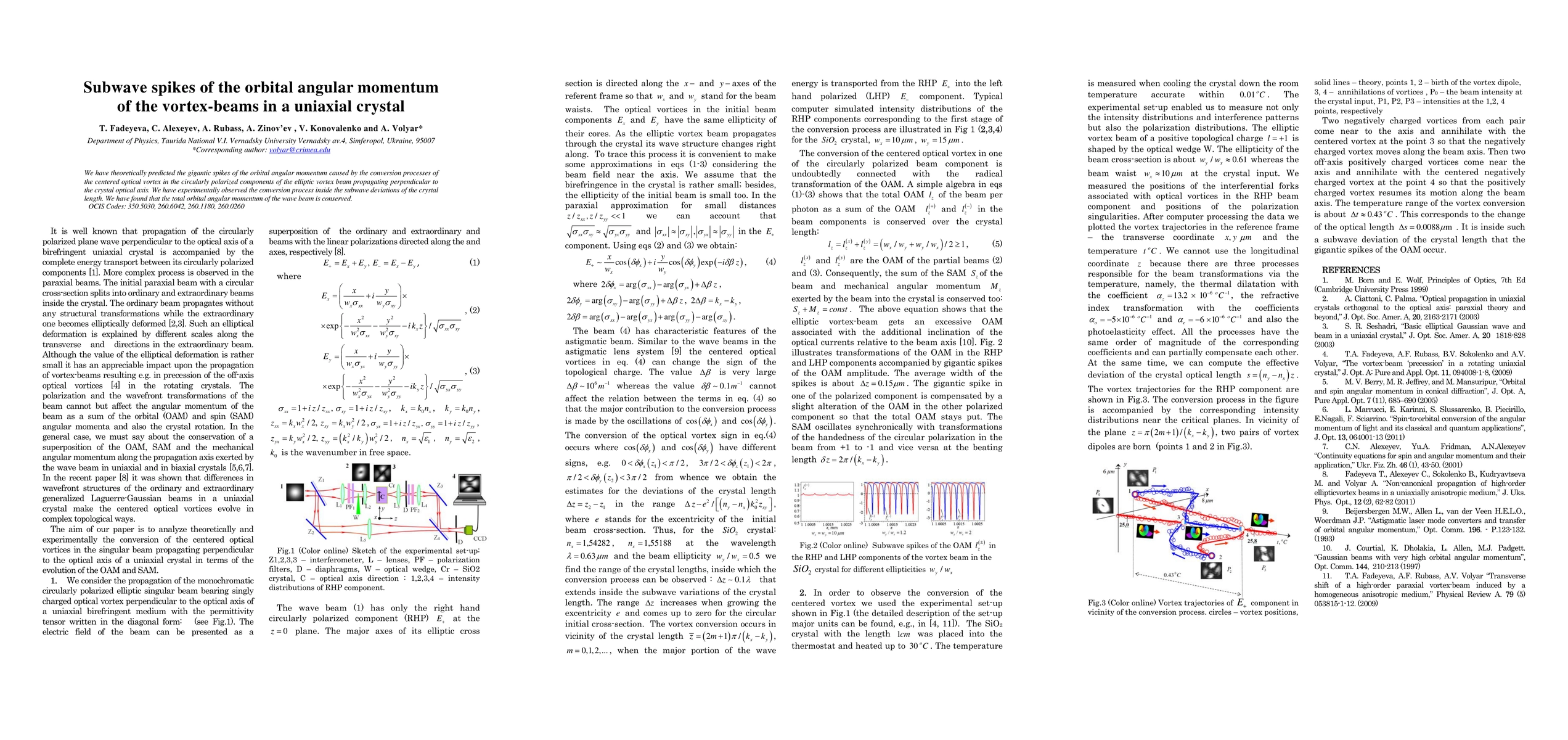 We have theoretically predicted the gigantic spikes of the orbital angular momentum caused by the conversion processes of the centered optical vortex in the circularly polarized components of the elliptic vortex beam propagating perpendicular to the crystal optical axis. We have experimentally observed the conversion process inside the subwave deviations of the crystal length. We have found that the total orbital angular momentum of the wave beam is conserved.