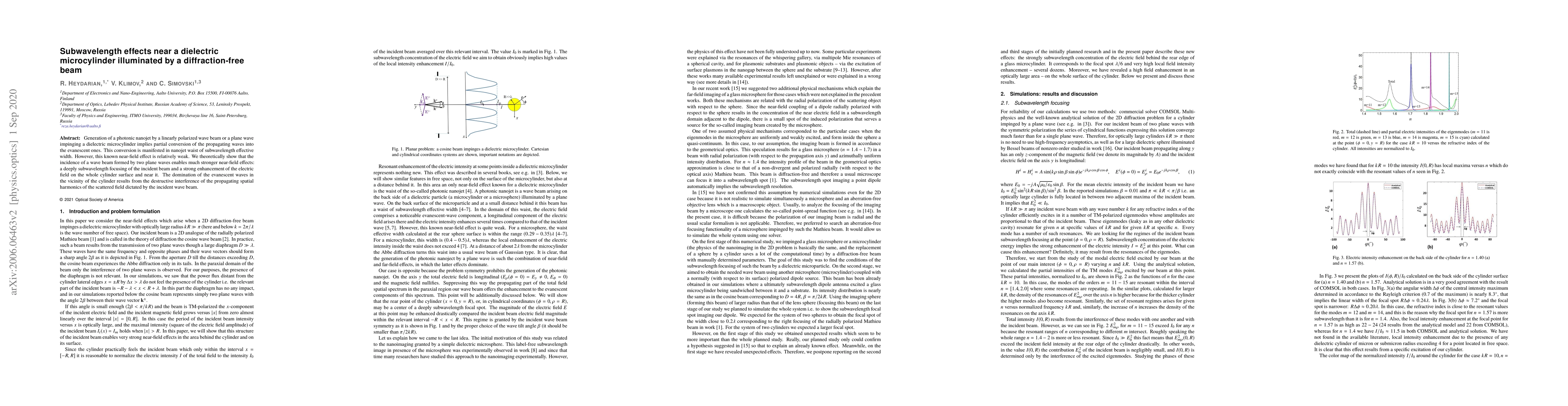 Generation of a photonic nanojet by a linearly polarized wave beam or a plane wave impinging a dielectric microcylinder implies partial conversion of the propagating waves into the evanescent ones. This conversion is manifested in nanojet waist of subwavelength effective width. However, this known near-field effect is relatively weak. We theoretically show that the incidence of a wave beam formed by two plane waves enables much stronger near-field effects: a deeply subwavelength focusing of the incident beam and a strong enhancement of the electric field on the whole cylinder surface and near it. The domination of the evanescent waves in the vicinity of the cylinder results from the destructive interference of the propagating spatial harmonics of the scattered field dictated by the incident wave beam.