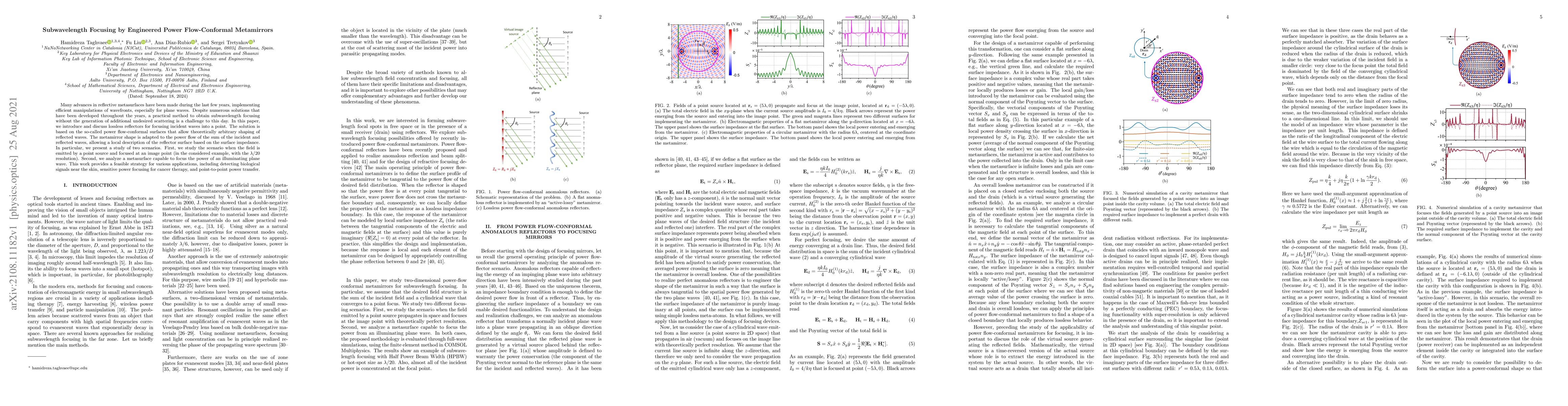 This paper proposes lossless reflectors using power flow-conformal metamirrors for subwavelength focusing of incident waves, achieving resolution down to λ/20 without undesired scattering. The metamirrors adapt their shape to the power flow of incident and reflected waves, enabling applications like biological signal detection, cancer therapy, and power transfer.