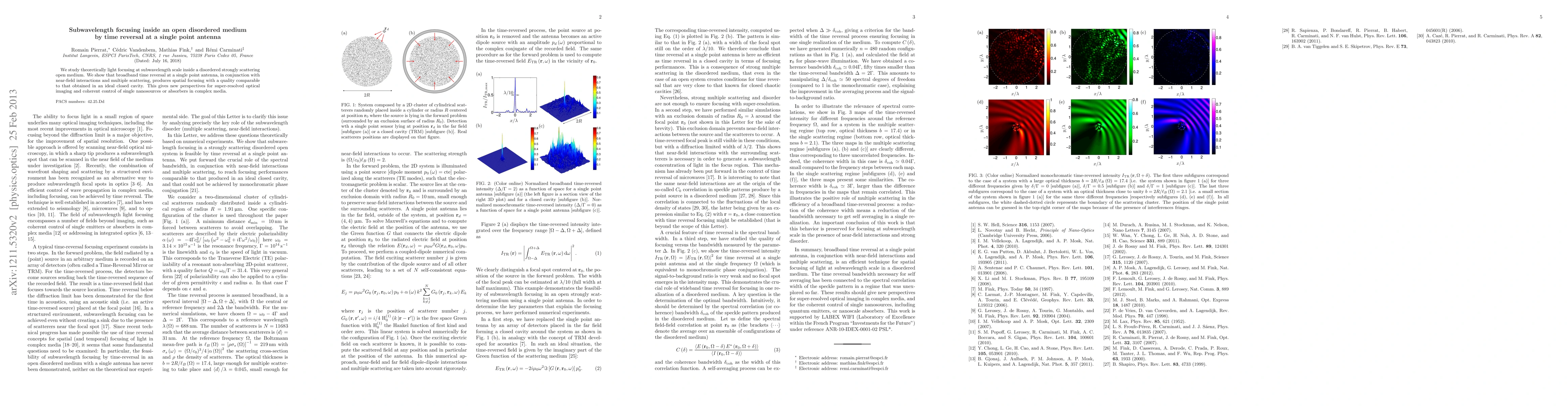 This paper theoretically explores subwavelength light focusing within a disordered medium using broadband time reversal at a single point antenna, demonstrating spatial focusing comparable to ideal closed cavities, which opens new avenues for super-resolved optical imaging and control of nanosources in complex media.