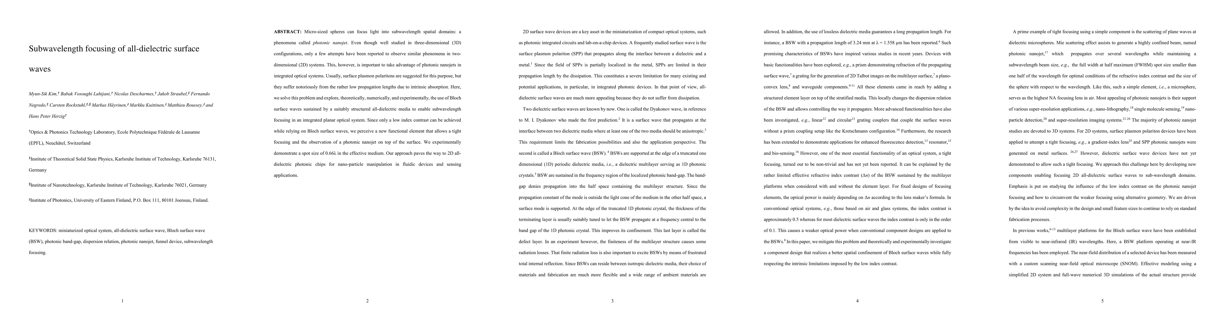 This paper investigates the use of Bloch surface waves in all-dielectric media to achieve subwavelength focusing of light, demonstrating a photonic nanojet in a 2D system. Experimental results show a focused spot size of 0.66λ, paving the way for integrated optical systems in fluidic devices and sensing applications.