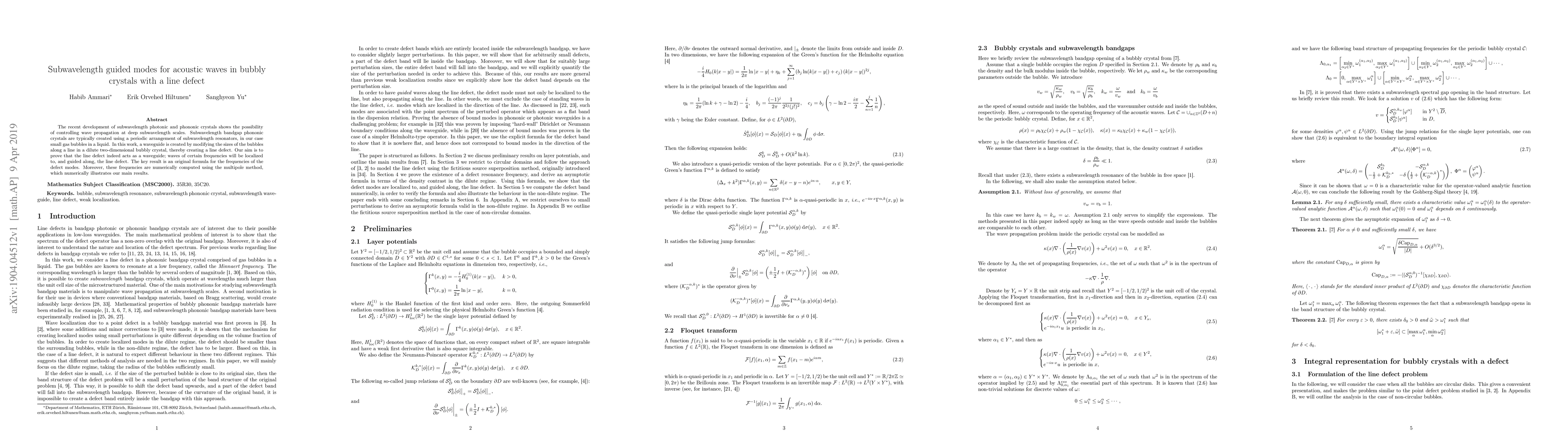 This paper investigates the formation of subwavelength guided modes in acoustic waves through a line defect in a two-dimensional bubbly crystal. The study derives a formula for the frequencies of the defect modes and uses the multipole method to numerically validate these frequencies, proving the defect acts as a waveguide for certain frequencies.
