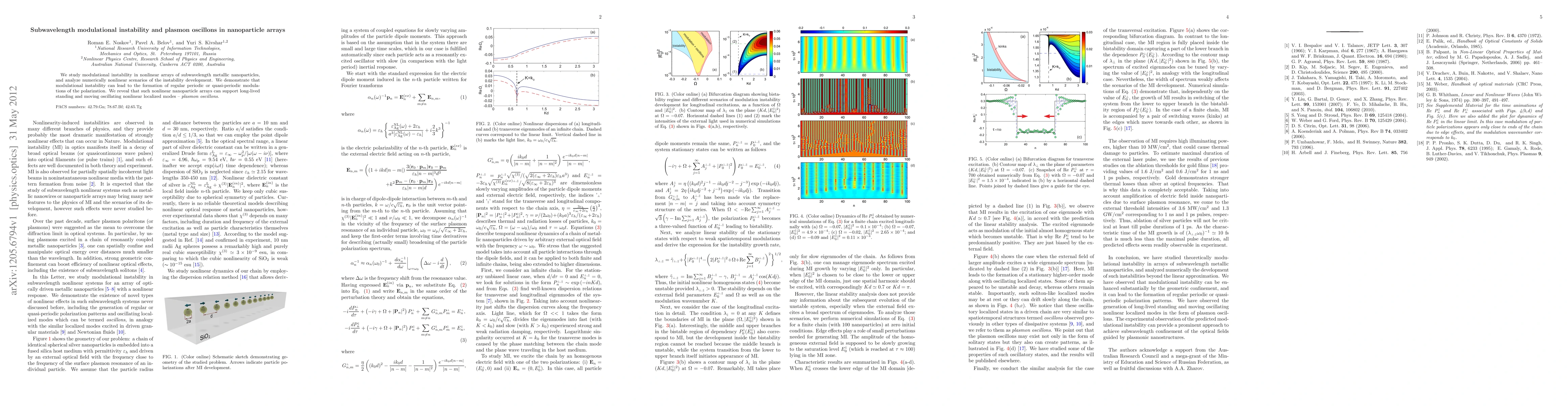 This paper investigates modulational instability in subwavelength metallic nanoparticle arrays, revealing the formation of regular or quasi-periodic polarization modulations and the emergence of long-lived standing and moving oscillating modes known as plasmon oscillons.