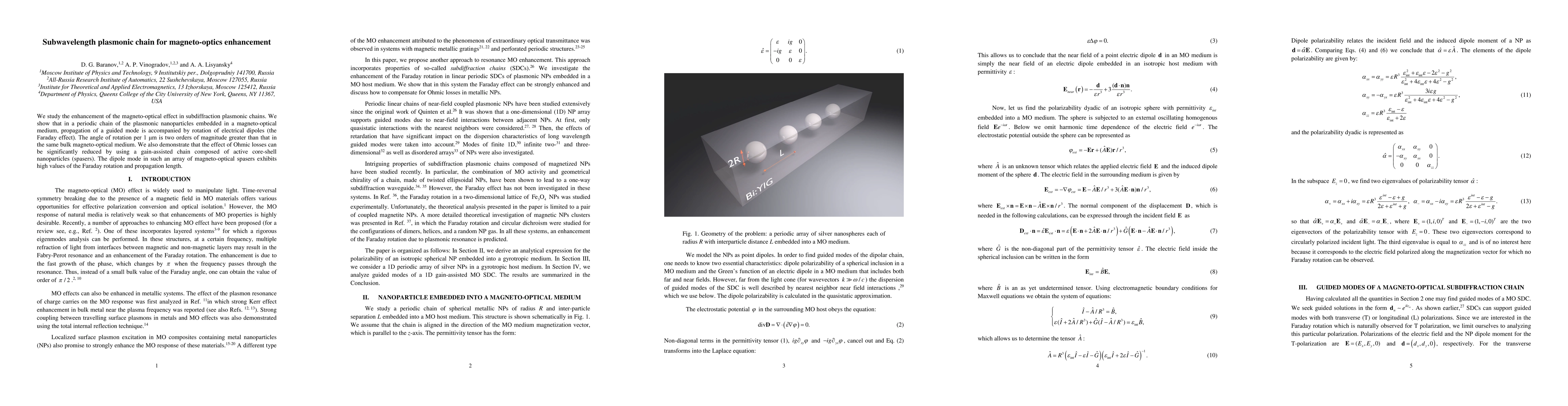 We study the enhancement of the magneto-optical effect in subdiffraction plasmonic chains. We show that in a periodic chain of the plasmonic nanoparticles embedded in a magneto-optical medium, propagation of a guided mode is accompanied by rotation of electrical dipoles (the Faraday effect). The angle of rotation per 1 {\mu}m is two orders of magnitude greater than that in the same bulk magneto-optical medium. We also demonstrate that the effect of Ohmic losses can be significantly reduced by using a gain-assisted chain composed of active core-shell nanoparticles (spasers). The dipole mode in such an array of magneto-optical spasers exhibits high values of the Faraday rotation and propagation length.