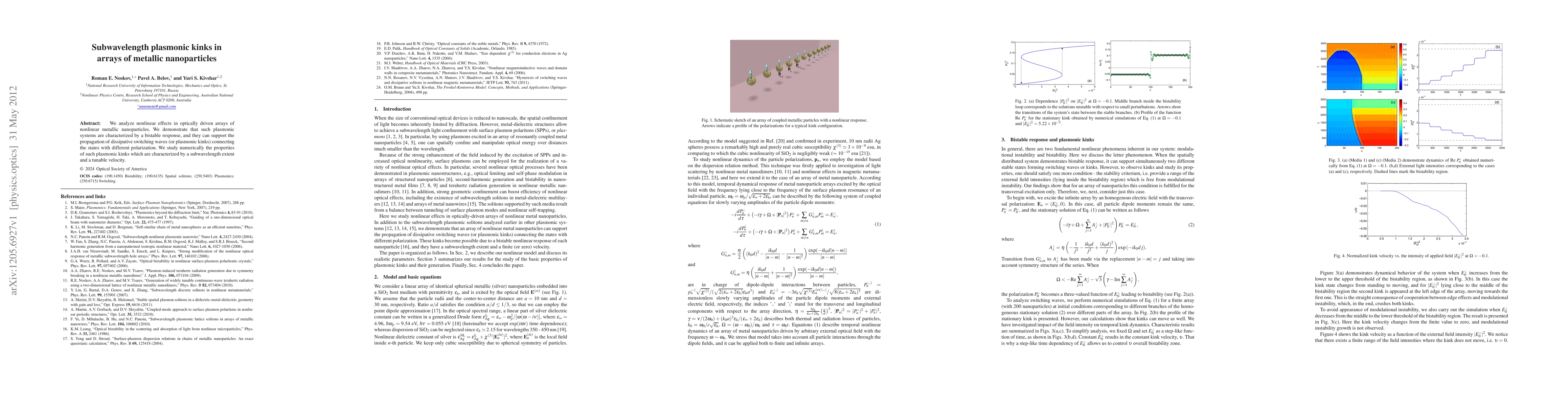 This paper investigates nonlinear optical effects in arrays of metallic nanoparticles, revealing bistable responses and the propagation of subwavelength plasmonic kinks. These kinks, with tunable velocities, connect states of different polarization in the plasmonic system.