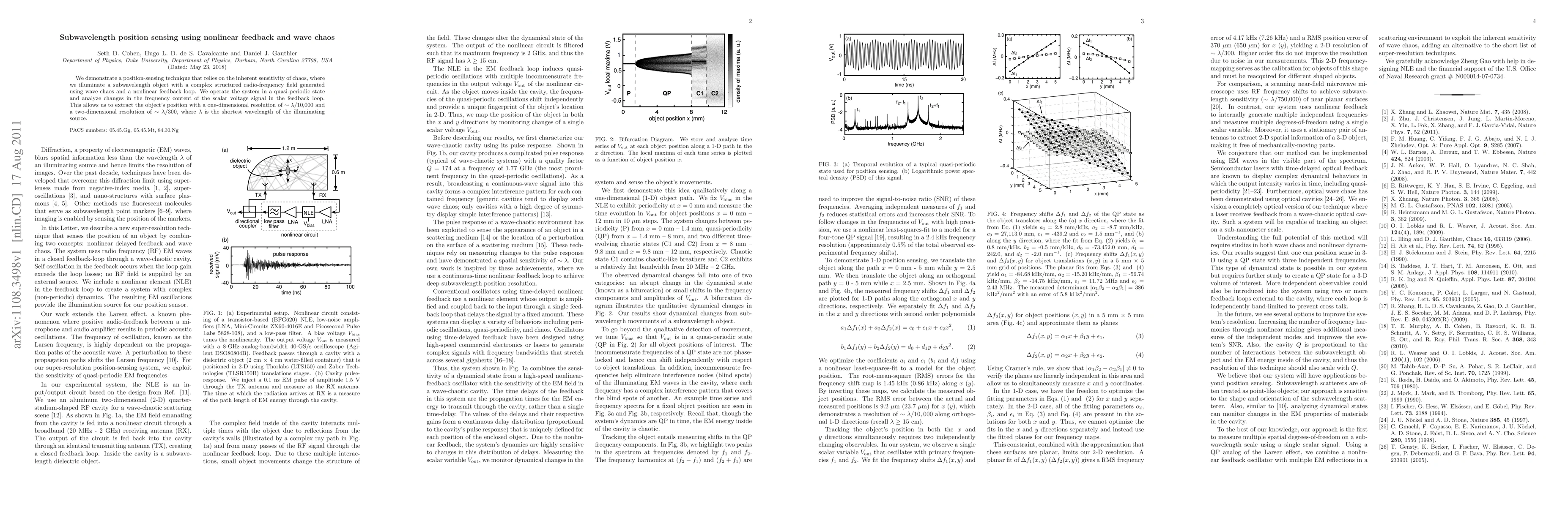 The research presents a novel position-sensing technique using wave chaos and nonlinear feedback, achieving subwavelength resolution of ~lambda/10,000 in one dimension and ~lambda/300 in two dimensions, operating in a quasi-periodic state and analyzing frequency changes in the feedback loop signal.
