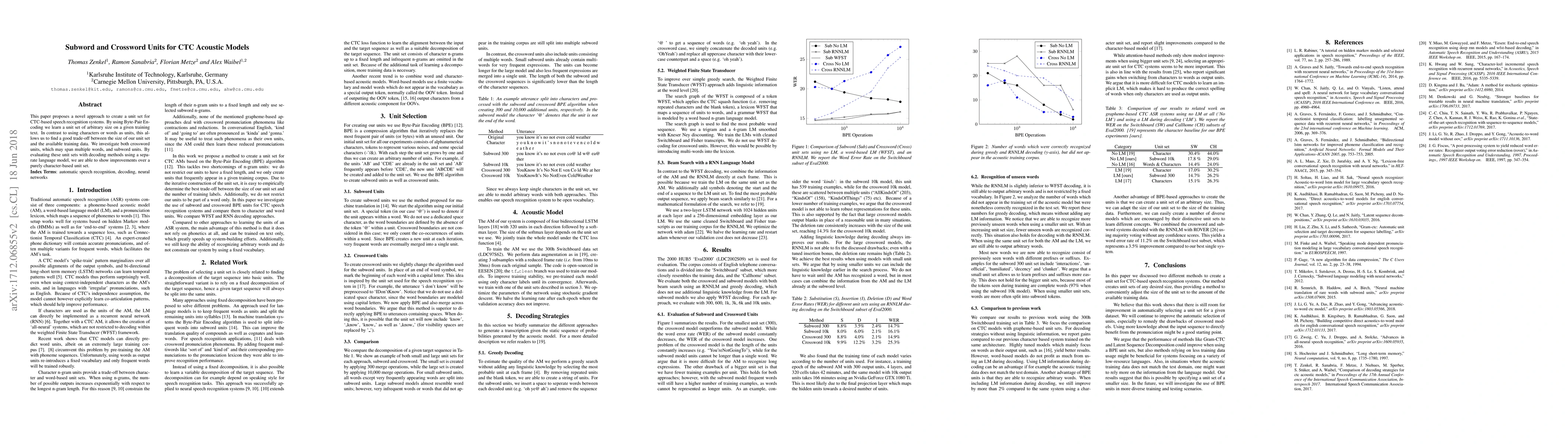This paper introduces a novel unit set for CTC-based speech recognition using Byte Pair Encoding, achieving a balance between unit set size and training data. It evaluates both Crossword and Subword units, achieving state-of-the-art results when combined with decoding methods and a separate language model.