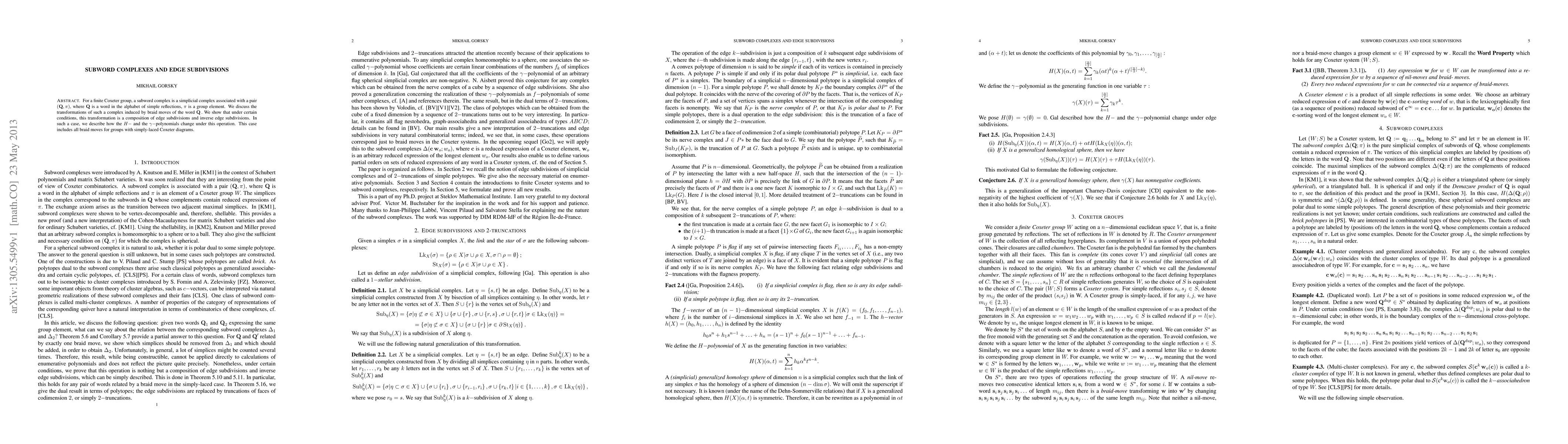 For a finite Coxeter group, a subword complex is a simplicial complex associated with a pair (Q, \pi), where Q is a word in the alphabet of simple reflections, $\pi$ is a group element. We discuss the transformations of such a complex induced by braid moves of the word Q. We show that under certain conditions, this transformation is a composition of edge subdivisions and inverse edge subdivisions. In such a case, we describe how the H- and the \gamma-polynomials change under this operation. This case includes all braid moves for groups with simply-laced Coxeter diagrams.