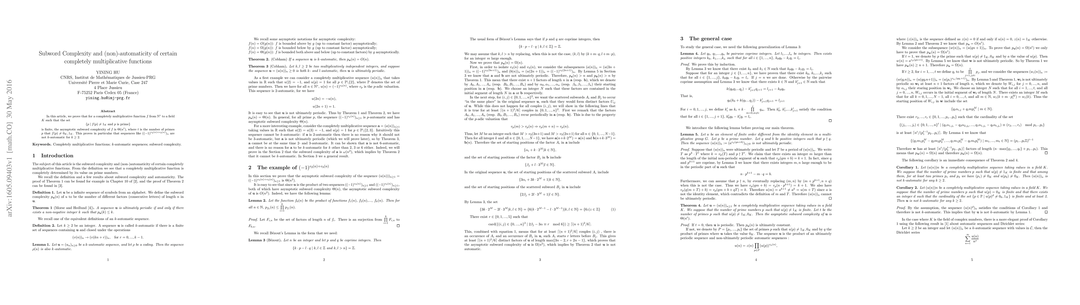 In this article, we prove that for a completely multiplicative function $f$ from $\mathbb{N}^*$ to a field $K$ such that the set $$\{p \;|\; f(p)\neq 1_K \;\mbox{and }p \mbox{ is prime}\}$$ is finite, the asymptotic subword complexity of $f$ is $\Theta(n^t)$, where $t$ is the number of primes $p$ that $f(p)\neq 0_K, 1_K$. This proves in particular that sequences like $((-1)^{v_2(n)+v_3(n)})_n$ are not $k$-automatic for $k\geq 2$.