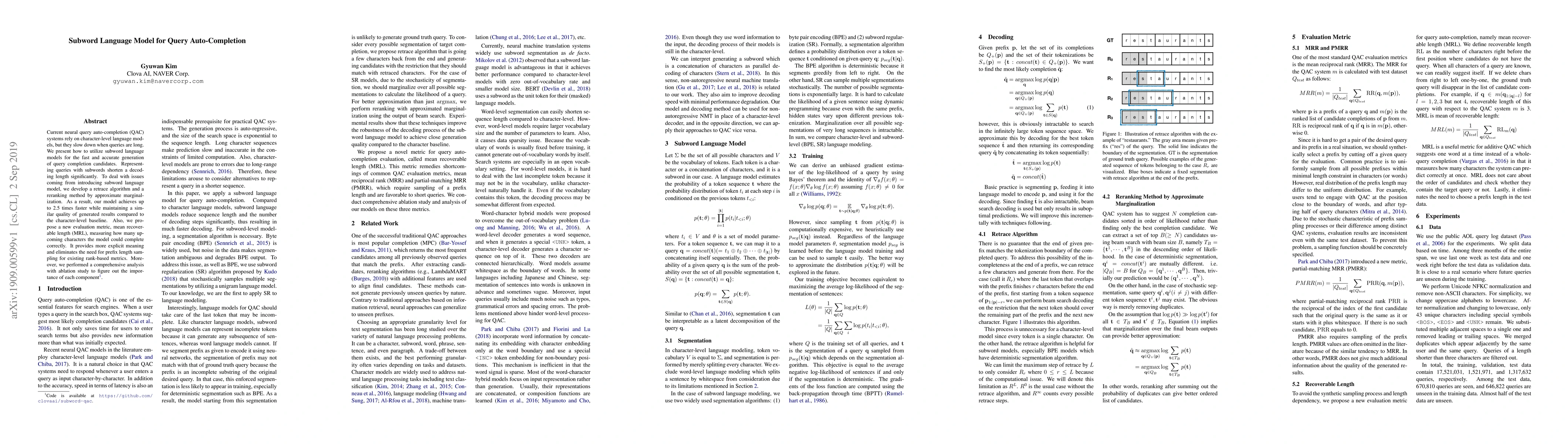 This paper presents a subword language model for efficient query auto-completion, achieving up to 2.5 times faster performance with similar quality compared to character-level models. It introduces a retrace algorithm and a reranking method to address subword model issues, and proposes a new evaluation metric, mean recoverable length (MRL).