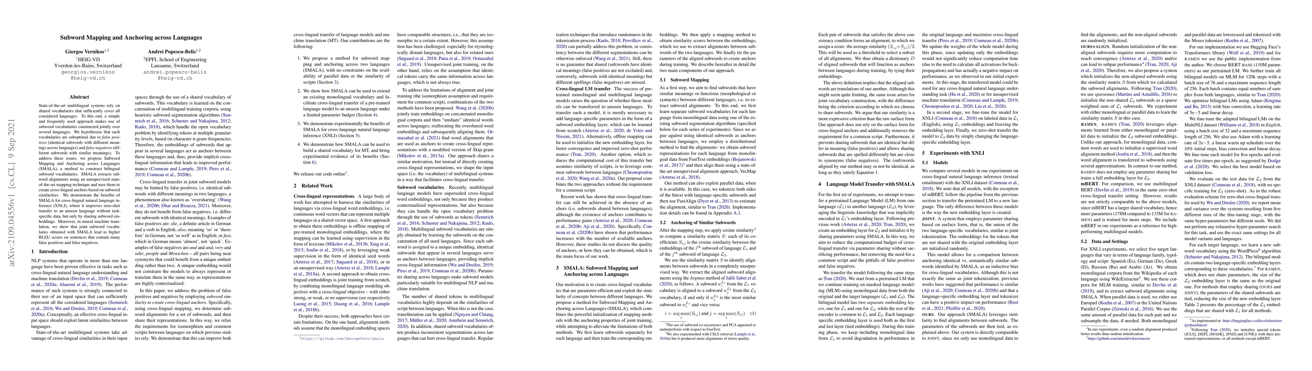 The paper proposes Subword Mapping and Anchoring across Languages (SMALA) to construct bilingual subword vocabularies that mitigate false positives and negatives in joint multilingual systems. SMALA improves zero-shot transfer in cross-lingual natural language inference and enhances translation performance by reducing false positives and negatives.