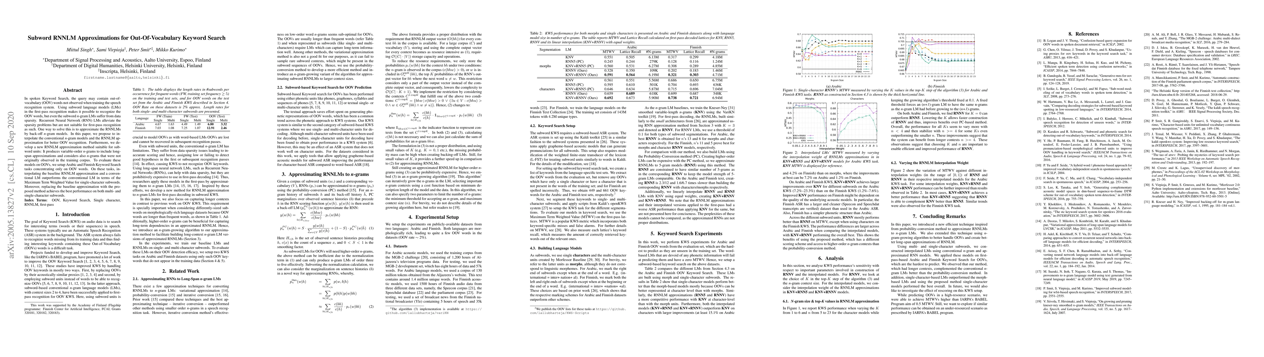 In spoken Keyword Search, the query may contain out-of-vocabulary (OOV) words not observed when training the speech recognition system. Using subword language models (LMs) in the first-pass recognition makes it possible to recognize the OOV words, but even the subword n-gram LMs suffer from data sparsity. Recurrent Neural Network (RNN) LMs alleviate the sparsity problems but are not suitable for first-pass recognition as such. One way to solve this is to approximate the RNNLMs by back-off n-gram models. In this paper, we propose to interpolate the conventional n-gram models and the RNNLM approximation for better OOV recognition. Furthermore, we develop a new RNNLM approximation method suitable for subword units: It produces variable-order n-grams to include long-span approximations and considers also n-grams that were not originally observed in the training corpus. To evaluate these models on OOVs, we setup Arabic and Finnish Keyword Search tasks concentrating only on OOV words. On these tasks, interpolating the baseline RNNLM approximation and a conventional LM outperforms the conventional LM in terms of the Maximum Term Weighted Value for single-character subwords. Moreover, replacing the baseline approximation with the proposed method achieves the best performance on both multi- and single-character subwords.