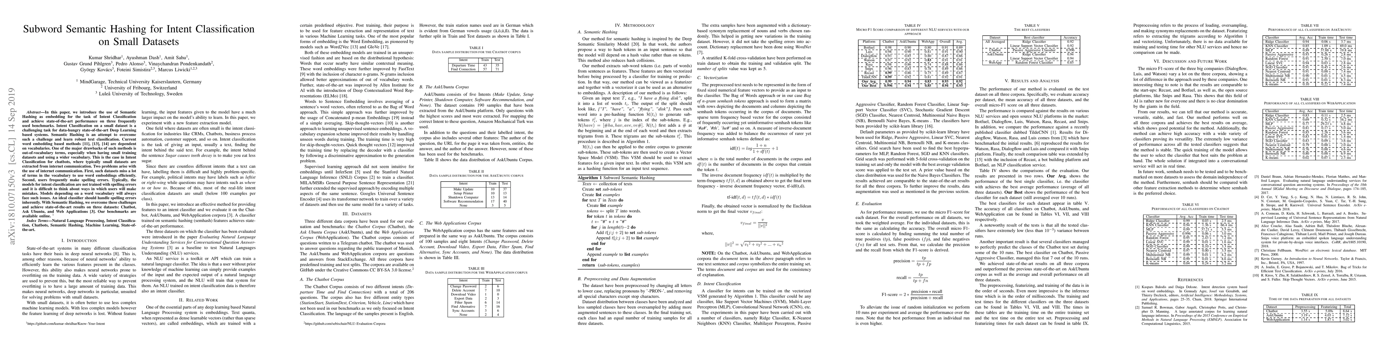 This paper proposes Semantic Hashing for Intent Classification on small datasets, achieving state-of-the-art performance on three benchmarks. It addresses the challenges of out-of-vocabulary terms and spelling errors, offering a robust solution for text classification in chatbots.