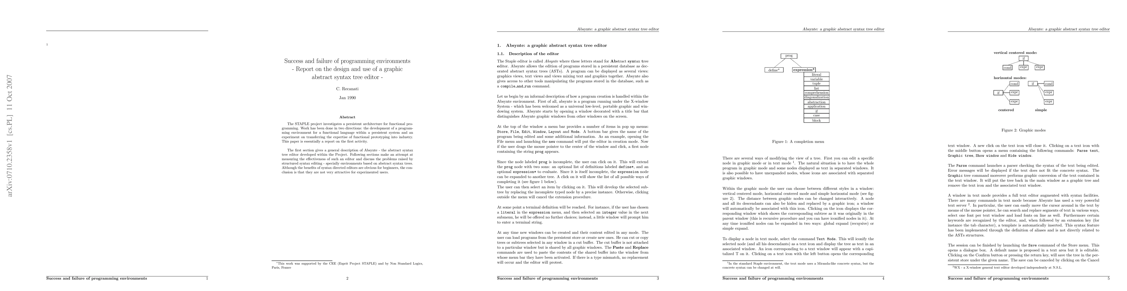 The STAPLE project investigated (at the end of the eighties), a persistent architecture for functional programming. Work has been done in two directions: the development of a programming environment for a functional language within a persistent system and an experiment on transferring the expertise of functional prototyping into industry. This paper is a report on the first activity. The first section gives a general description of Absynte - the abstract syntax tree editor developed within the Project. Following sections make an attempt at measuring the effectiveness of such an editor and discuss the problems raised by structured syntax editing - specially environments based on abstract syntax trees.