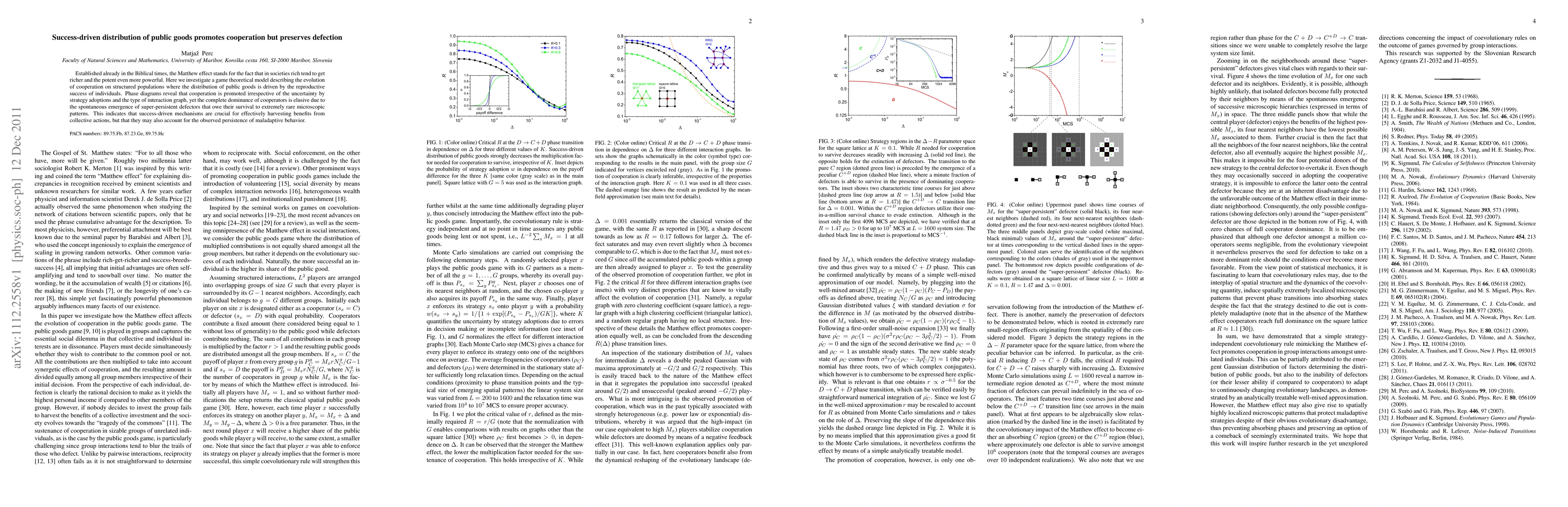This paper explores a game theoretical model where cooperation evolves in populations based on the reproductive success of individuals. While success-driven distribution of public goods promotes cooperation, it also allows for the persistence of defection due to rare microscopic patterns, indicating that while beneficial for collective actions, such mechanisms can also sustain maladaptive behaviors.