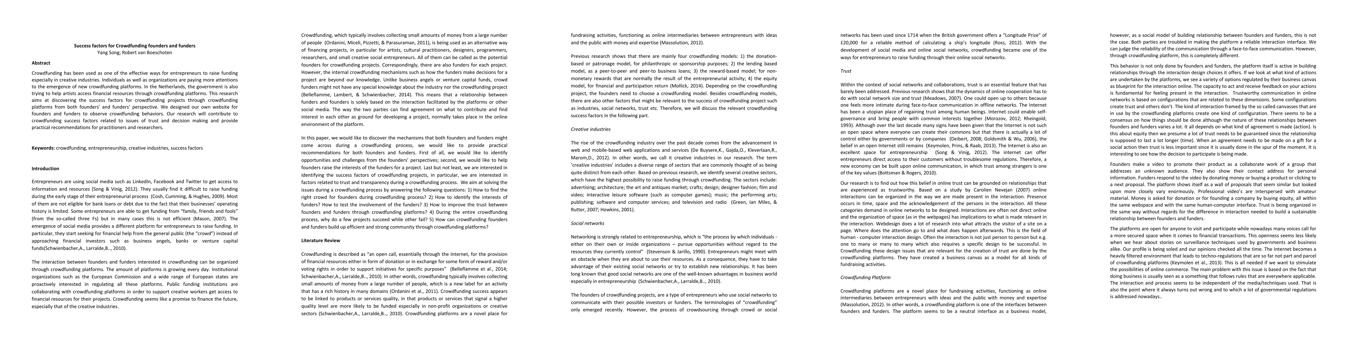 Crowdfunding has been used as one of the effective ways for entrepreneurs to raise funding especially in creative industries. Individuals as well as organizations are paying more attentions to the emergence of new crowdfunding platforms. In the Netherlands, the government is also trying to help artists access financial resources through crowdfunding platforms. This research aims at discovering the success factors for crowdfunding projects through crowdfunding platforms from both founders and funders perspective. We designed our own website for founders and funders to observe crowdfunding behaviors. Our research will contribute to crowdfunding success factors related to issues of trust and decision making and provide practical recommendations for practitioners and researchers.