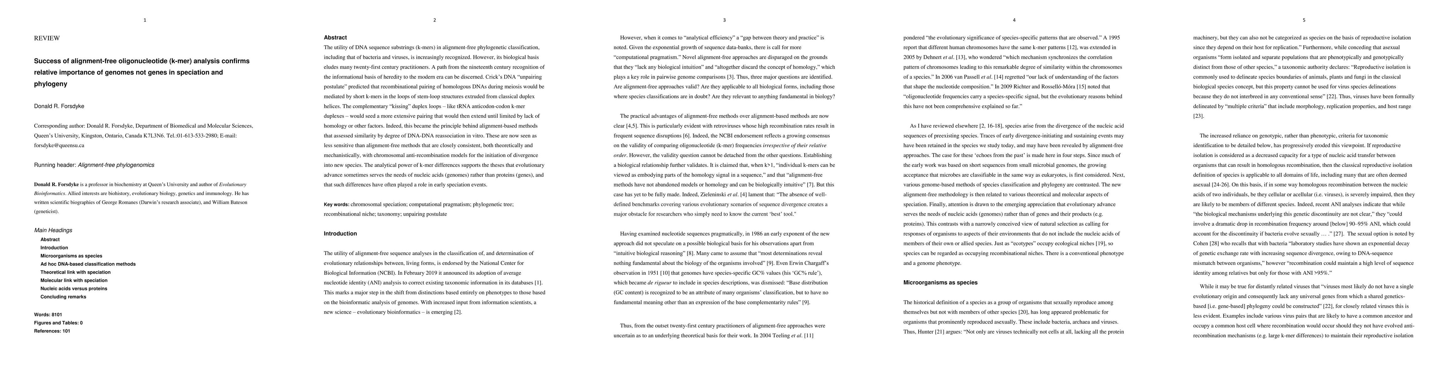 The utility of DNA sequence substrings (k-mers) in alignment-free phylogenetic classification, including that of bacteria and viruses, is increasingly recognized. However, its biological basis eludes many twenty-first century practitioners. A path from the nineteenth century recognition of the informational basis of heredity to the modern era can be discerned. Crick's DNA "unpairing postulate" predicted that recombinational pairing of homologous DNAs during meiosis would be mediated by short k-mers in the loops of stem-loop structures extruded from classical duplex helices. The complementary "kissing" duplex loops - like tRNA anticodon-codon k-mer duplexes - would seed a more extensive pairing that would then extend until limited by lack of homology or other factors. Indeed, this became the principle behind alignment-based methods that assessed similarity by degree of DNA-DNA reassociation in vitro. These are now seen as less sensitive than alignment-free methods that are closely consistent, both theoretically and mechanistically, with chromosomal anti-recombination models for the initiation of divergence into new species. The analytical power of k-mer differences supports the theses that evolutionary advance sometimes serves the needs of nucleic acids (genomes) rather than proteins (genes), and that such differences have often played a role in early speciation events.