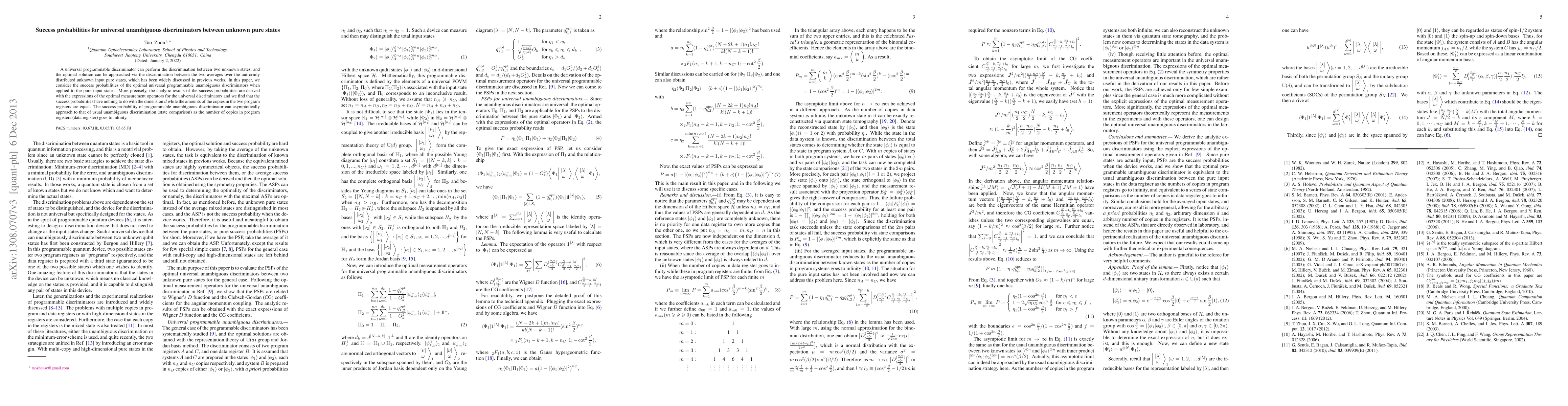 This paper derives analytic expressions for the success probabilities of optimal universal unambiguous discriminators applied to unknown pure states, finding that success probabilities are independent of the state dimension and approach those of usual unambiguous discrimination as the number of copies in program registers increases.