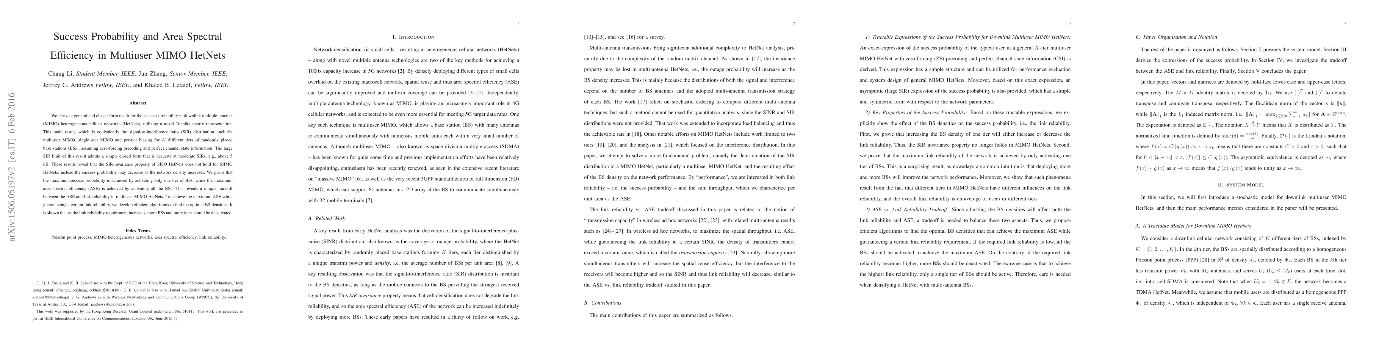 This study finds that success probability decreases as network density increases in multiuser MIMO HetNets, revealing a tradeoff between area spectral efficiency and link reliability.