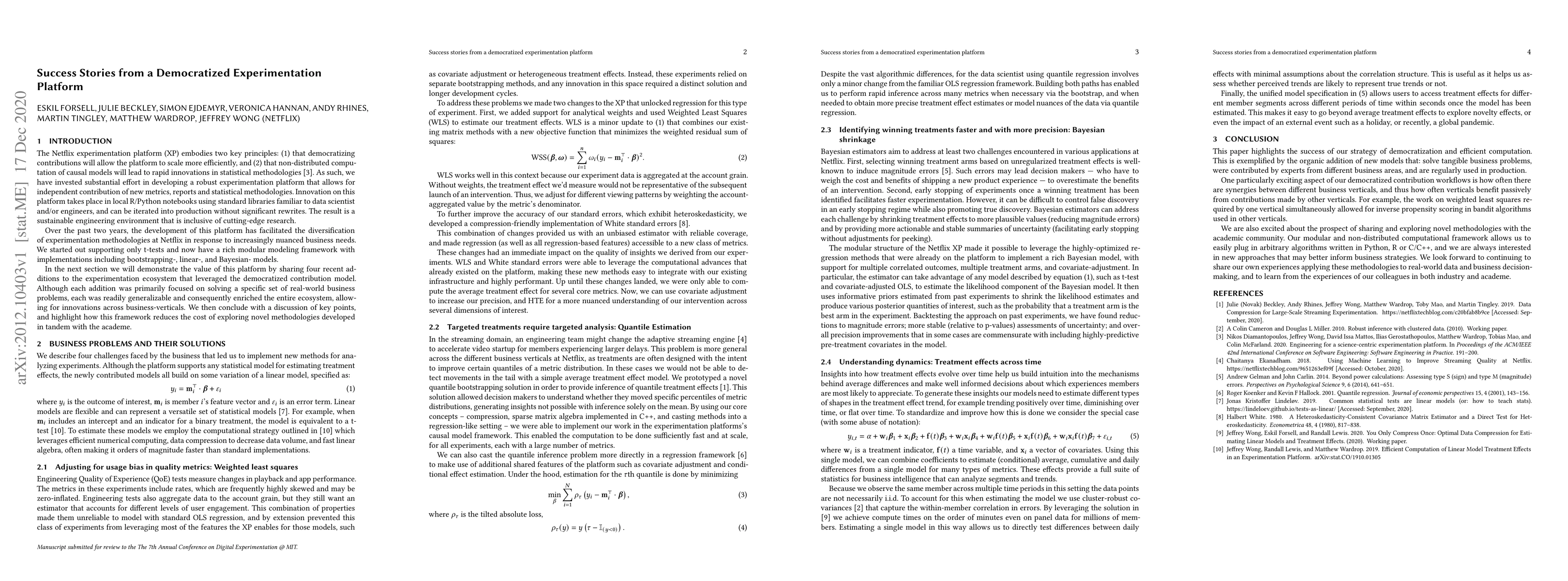 We demonstrate the effectiveness of democratization and efficient computation as key concepts of our experimentation platform (XP) by presenting four new models supported by the platform: 1) Weighted least squares, 2) Quantile bootstrapping, 3) Bayesian shrinkage, and 4) Dynamic treatment effects. Each model is motivated by a specific business problem but is generalizable and extensible. The modular structure of our platform allows independent innovation on statistical and computational methods. In practice, a technical symbiosis is created where increasingly advanced user contributions inspire innovations to the software that in turn enable further methodological improvements. This cycle adds further value to how the XP contributes to business solutions.