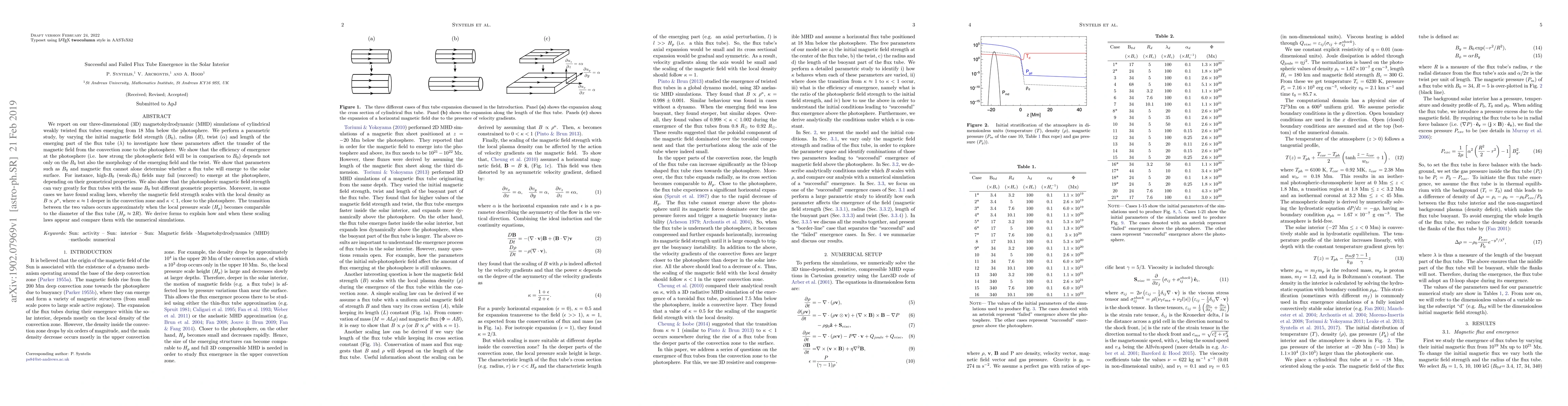 This research investigates the emergence of cylindrical flux tubes in the solar interior using 3D MHD simulations, finding that the success of emergence depends on initial magnetic field strength, radius, twist, and length. It reveals that high-$B_0$ fields may fail to emerge based on their geometry, and scaling laws for magnetic field strength with density vary with depth, transitioning when local pressure equals the flux tube diameter.