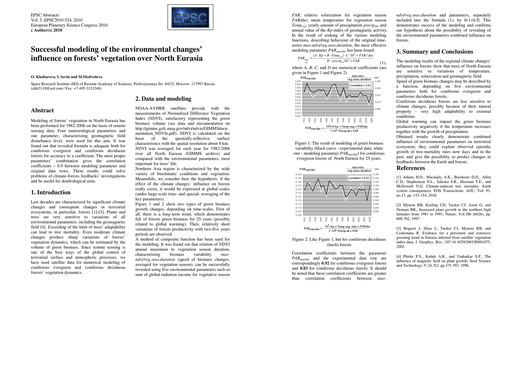 Modeling of forests' vegetation in North Eurasia has been performed for 1982-2006 on the basis of remote sensing data. Four meteorological parameters and one parameter, characterizing geomagnetic field disturbance level, were used for this aim. It was found out that revealed formula is adequate both for coniferous evergreen and coniferous deciduous forests for accuracy to a coefficient. The most proper parameters' combination gives the correlation coefficients ~ 0.9 between modeling parameter and original data rows. These results could solve problems of climate-forests feedbacks' investigations and be useful for dendrological aims.