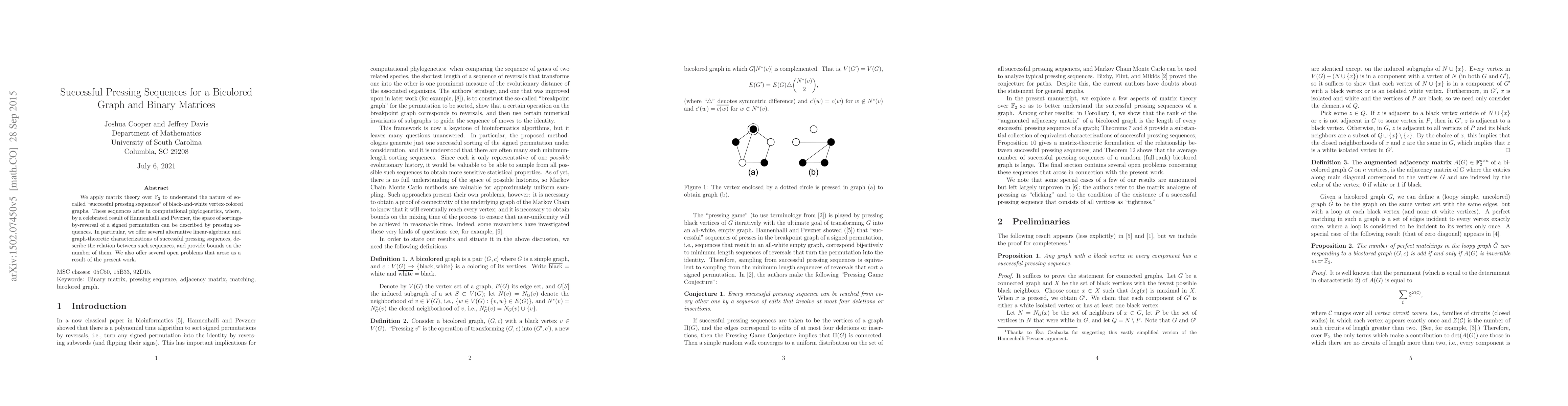 We apply matrix theory over $\mathbb{F}_2$ to understand the nature of so-called "successful pressing sequences" of black-and-white vertex-colored graphs. These sequences arise in computational phylogenetics, where, by a celebrated result of Hannenhalli and Pevzner, the space of sortings-by-reversal of a signed permutation can be described by pressing sequences. In particular, we offer several alternative linear-algebraic and graph-theoretic characterizations of successful pressing sequences, describe the relation between such sequences, and provide bounds on the number of them. We also offer several open problems that arose as a result of the present work.