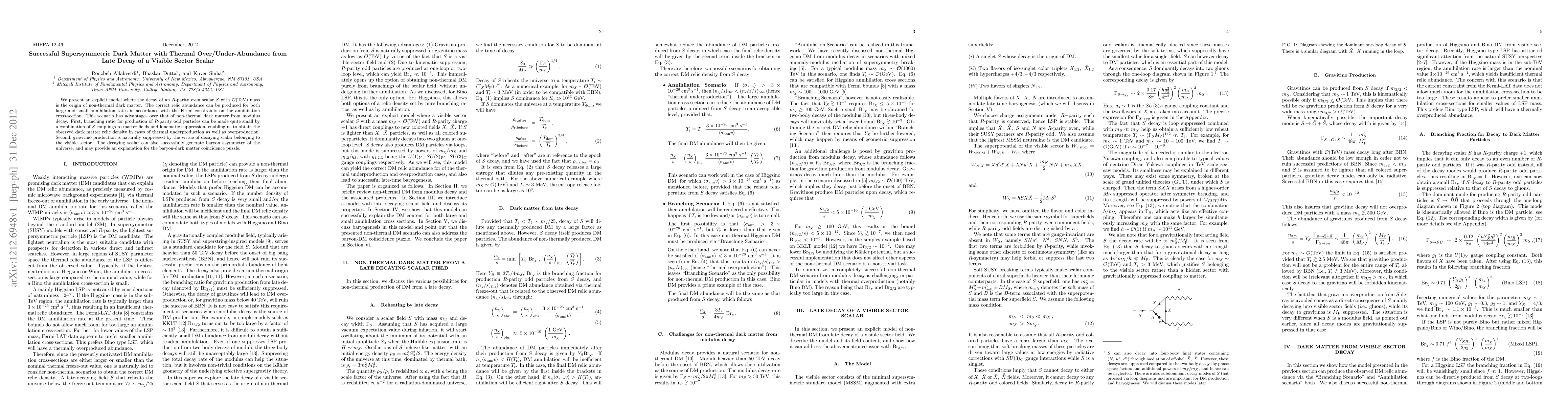 This paper proposes a supersymmetric model where a visible sector scalar $S$ decays to produce non-thermal dark matter, achieving the correct relic abundance despite thermal over/under-production. The model suppresses gravitino production and can generate baryon asymmetry, potentially solving the baryon-dark matter coincidence.