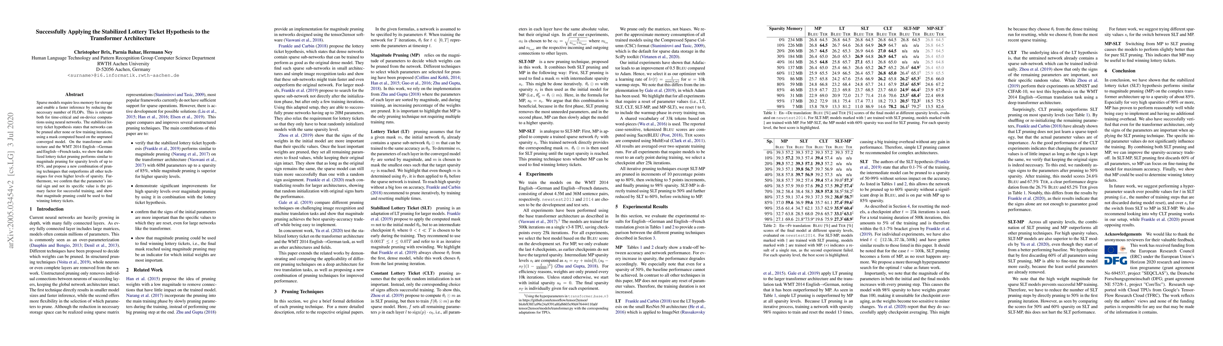 Sparse models require less memory for storage and enable a faster inference by reducing the necessary number of FLOPs. This is relevant both for time-critical and on-device computations using neural networks. The stabilized lottery ticket hypothesis states that networks can be pruned after none or few training iterations, using a mask computed based on the unpruned converged model. On the transformer architecture and the WMT 2014 English-to-German and English-to-French tasks, we show that stabilized lottery ticket pruning performs similar to magnitude pruning for sparsity levels of up to 85%, and propose a new combination of pruning techniques that outperforms all other techniques for even higher levels of sparsity. Furthermore, we confirm that the parameter's initial sign and not its specific value is the primary factor for successful training, and show that magnitude pruning could be used to find winning lottery tickets.