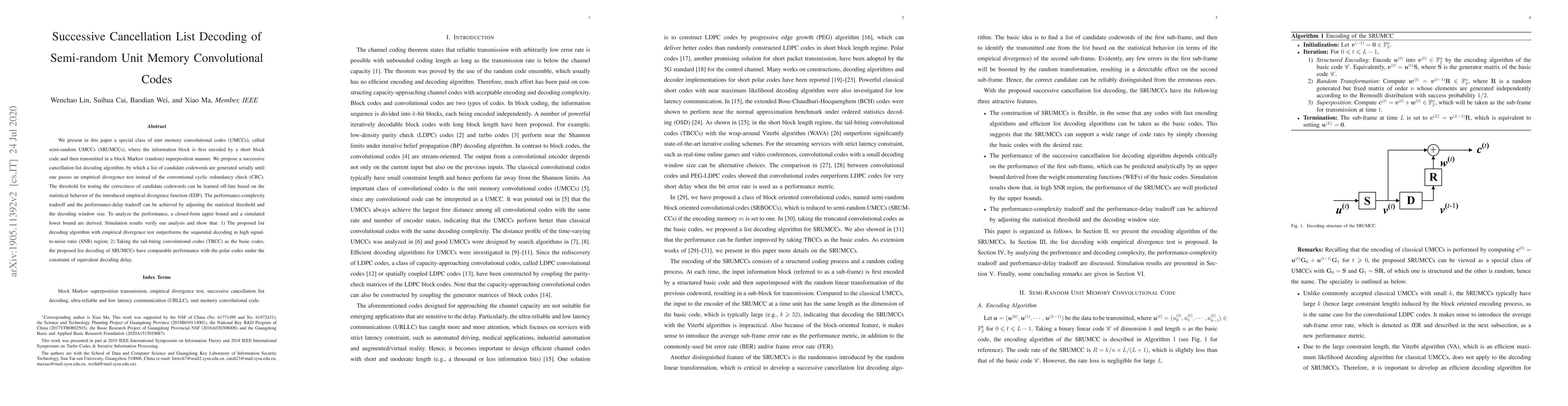 We present in this paper a special class of unit memory convolutional codes (UMCCs), called semi-random UMCCs (SRUMCCs), where the information block is first encoded by a short block code and then transmitted in a block Markov (random) superposition manner. We propose a successive cancellation list decoding algorithm, by which a list of candidate codewords are generated serially until one passes an empirical divergence test instead of the conventional cyclic redundancy check (CRC). The threshold for testing the correctness of candidate codewords can be learned off-line based on the statistical behavior of the introduced empirical divergence function (EDF). The performance-complexity tradeoff and the performance-delay tradeoff can be achieved by adjusting the statistical threshold and the decoding window size. To analyze the performance, a closed-form upper bound and a simulated lower bound are derived. Simulation results verify our analysis and show that: 1) The proposed list decoding algorithm with empirical divergence test outperforms the sequential decoding in high signal-to-noise ratio (SNR) region; 2) Taking the tail-biting convolutional codes (TBCC) as the basic codes, the proposed list decoding of SRUMCCs have comparable performance with the polar codes under the constraint of equivalent decoding delay.