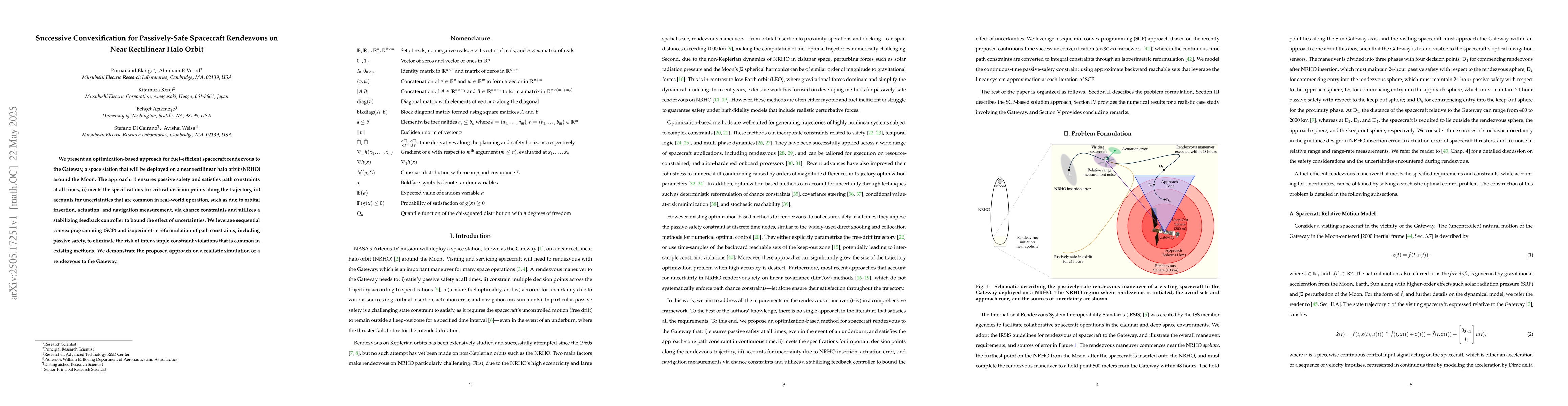 The paper presents a novel optimization framework combining SCP and isoperimetric reformulation for fuel-efficient, passively-safe spacecraft rendezvous with NRHO constraints.