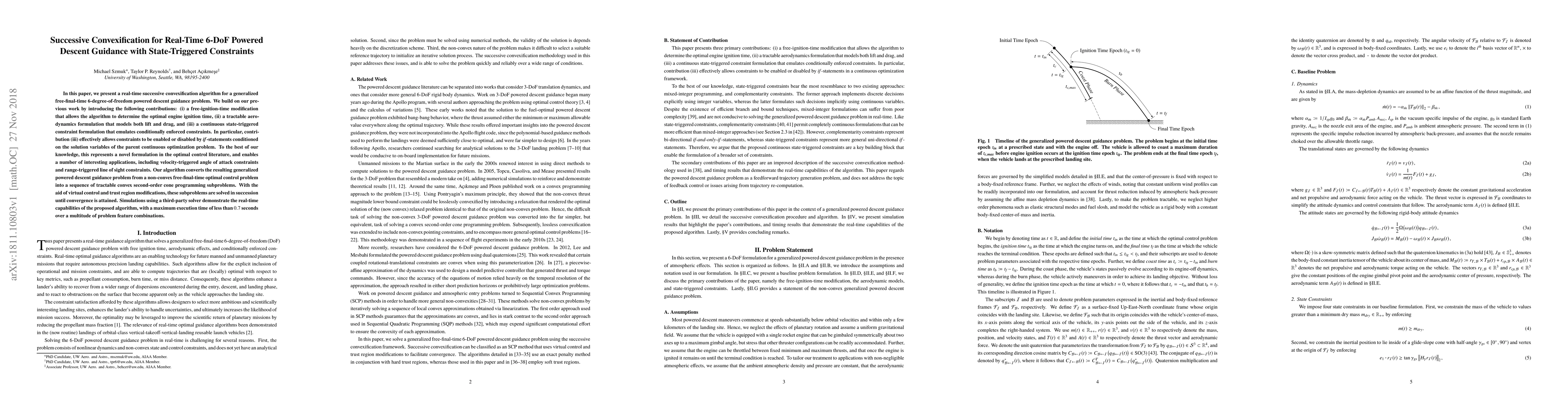 This paper introduces a real-time successive convexification algorithm for 6-DoF powered descent guidance, featuring optimal engine ignition time determination, aerodynamics modeling, and a novel continuous state-triggered constraint formulation. The algorithm transforms the non-convex problem into convex subproblems, solved sequentially to achieve real-time performance.